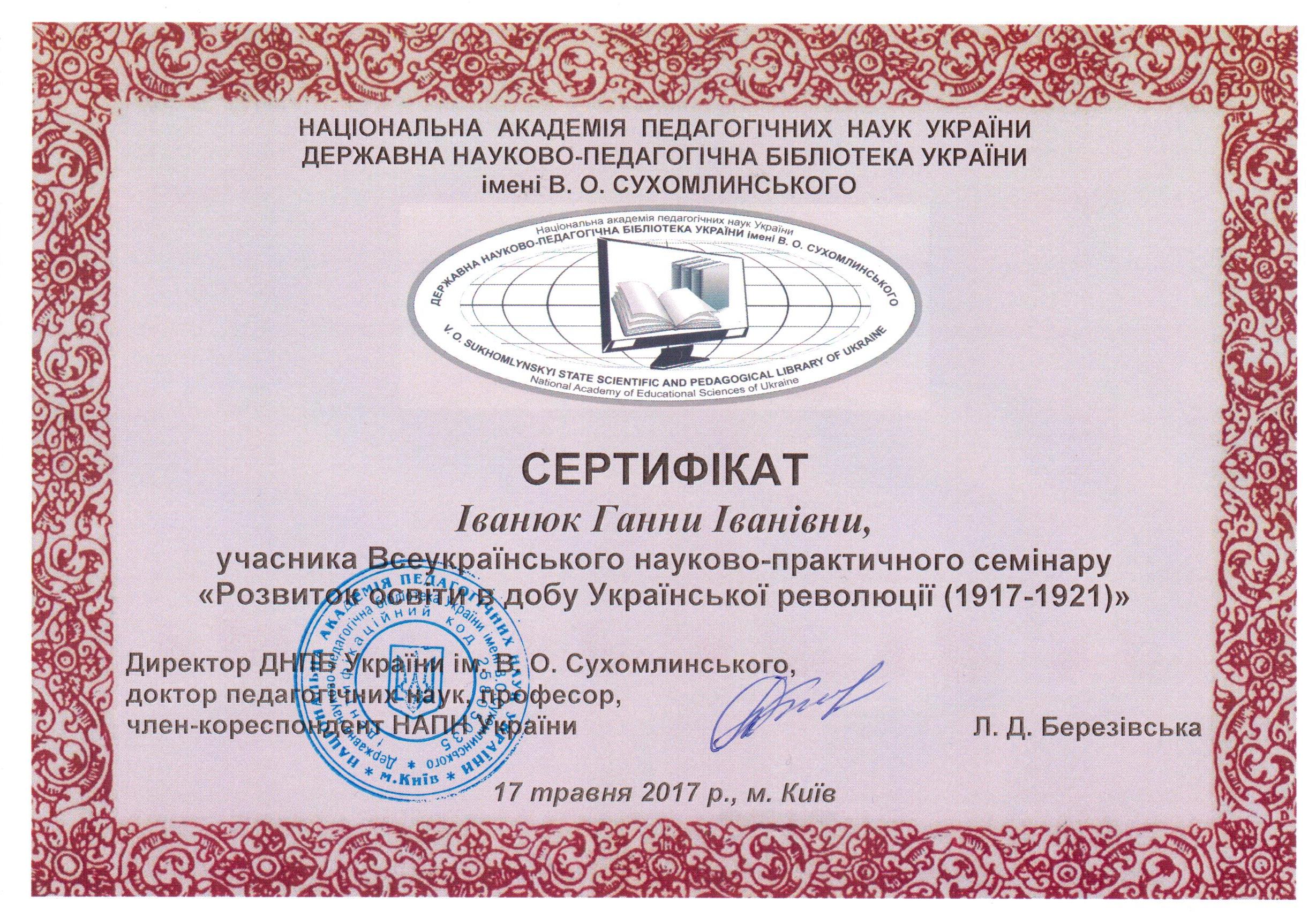 | 1652 | Всеукраїнський науково-практичний семінар "Розвиток освіти в добу Української революції (1917-1921)" | Нормативно-правове забезпечення становлення і функціонування нової школи в добу Української революції (1917-1921) | Державна науково-педагогічна бібліотека України імені В.О. Сухомлинського |