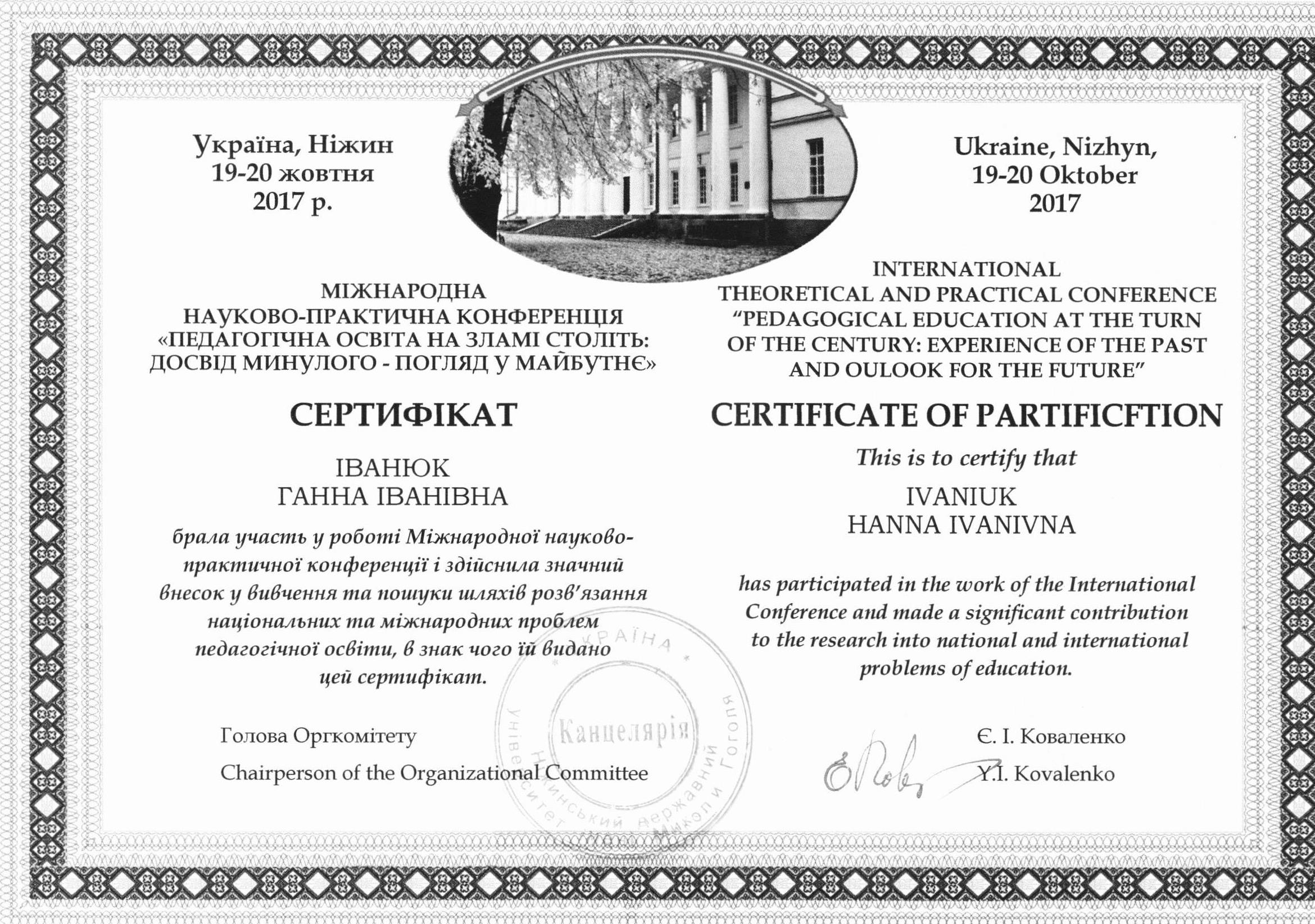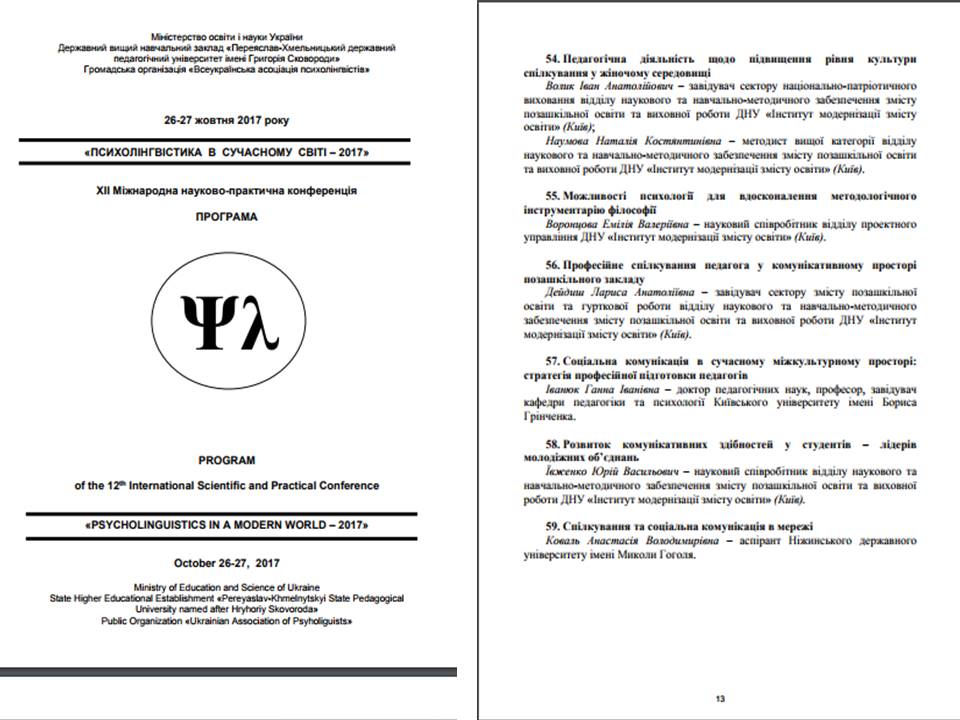 | 2004 | ХІІ Міжнародна науково-практична конференція "Психолінгвістика в сучасному світі - 2017" | Соціальна комунікація в сучасному міжкультурному просторі: стратегія професійної підготовки педагогів | ДВНЗ "Переяслав-Хмельницький державний педагогічний університет імені Григорія Сковороди" |
