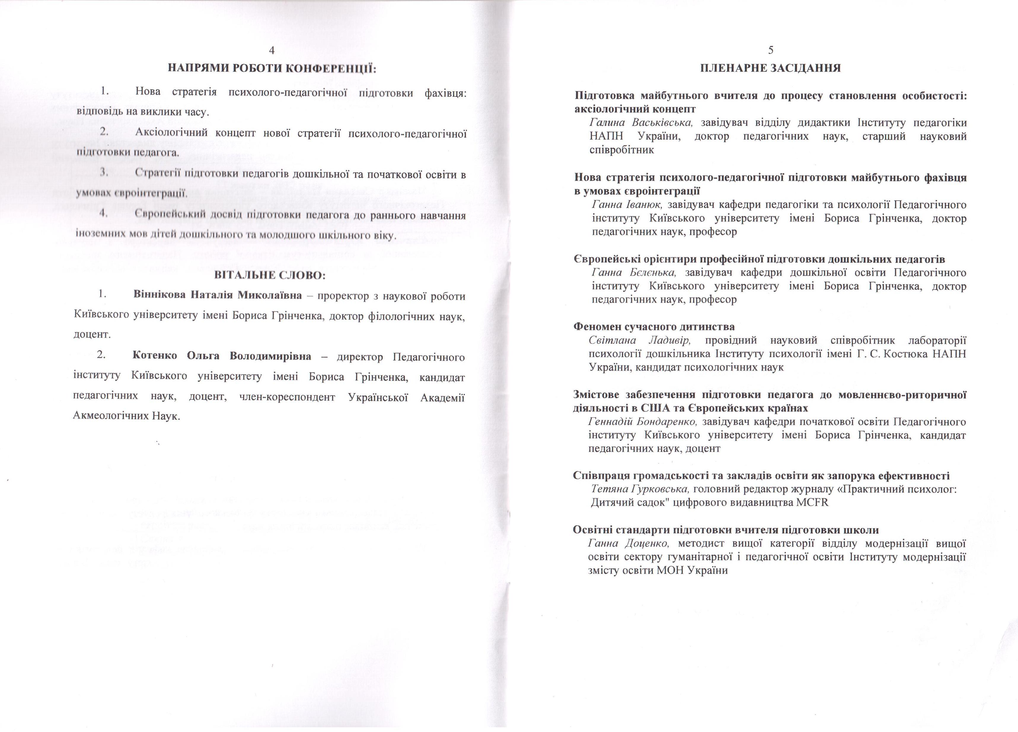 | 1891 | Професійна підготовка педагогів в умовах євроінтеграції: проблеми та перспективи | Нова стратегія психолого-педагогічної підготовки майбутнього фахівця в умовах євроінтеграції | Київський університет імені Бориса Грінченка |
