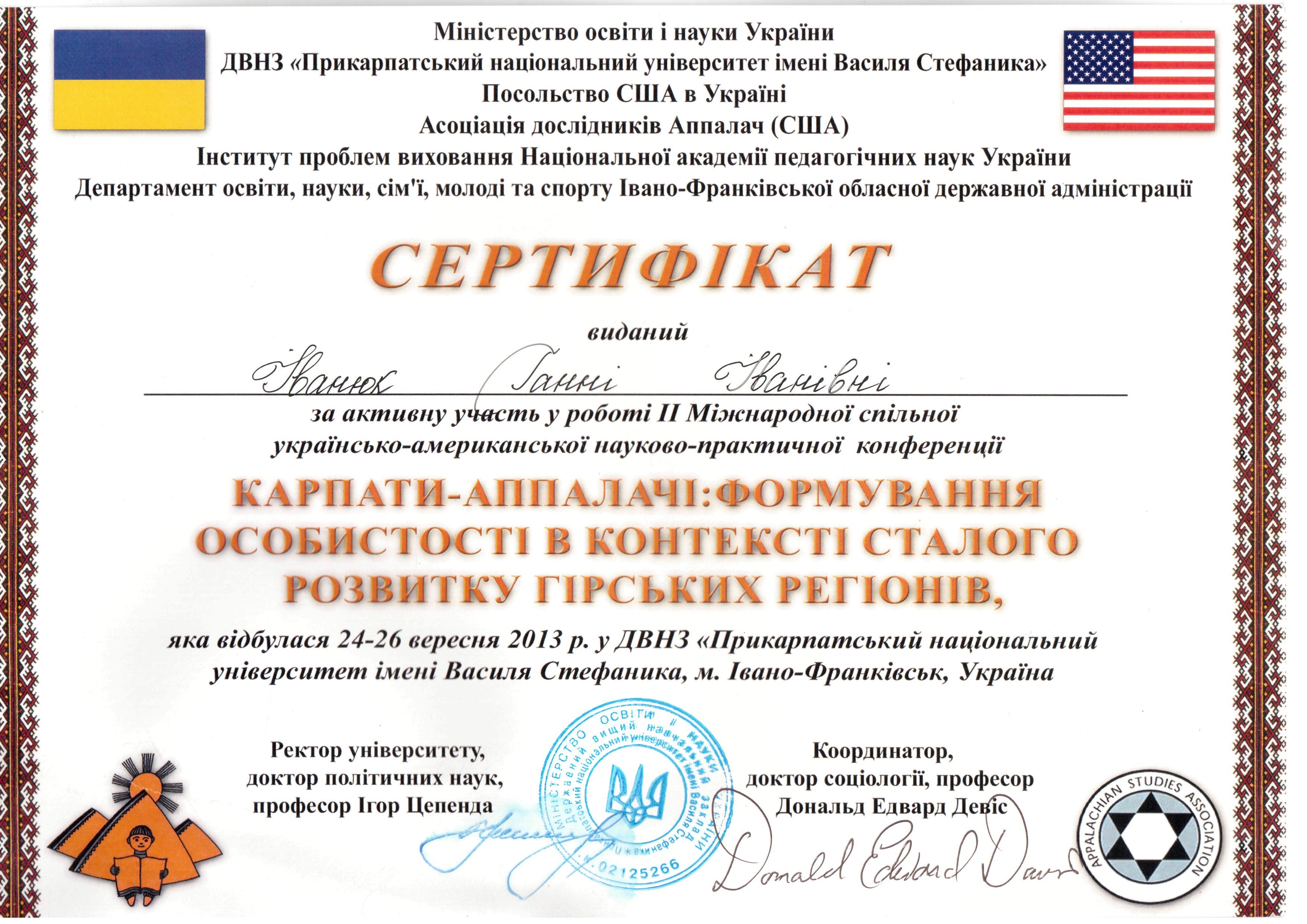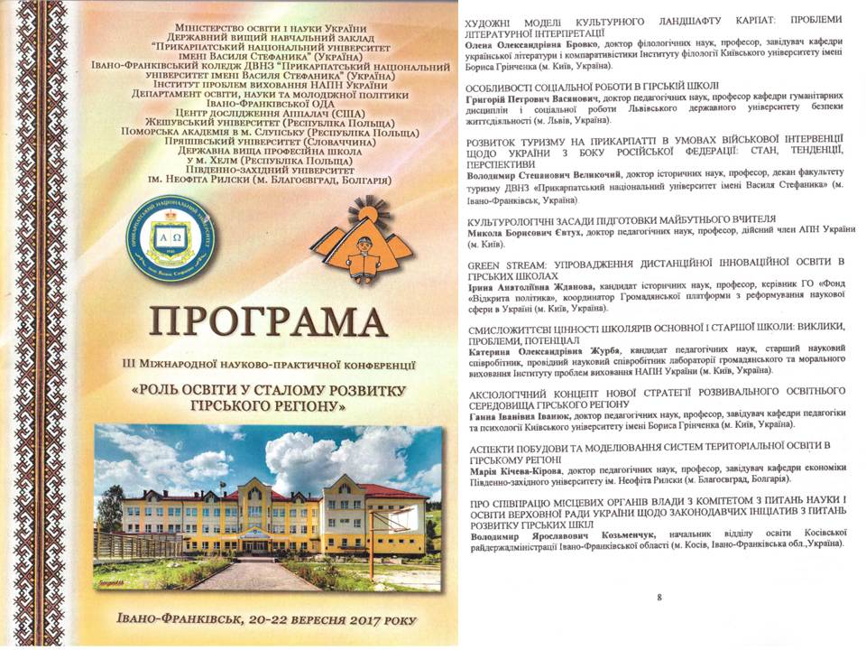 | 2183 | ІІІ Міжнародна науково-практична конференція "Роль освіти у сталому розвитку гірського регіону" | Аксіологічний концепт нової стратегії розвивального освітнього середовища гірського регіону | ДВНЗ "Прикарпатський національний університет імені Василя Стефаника" |