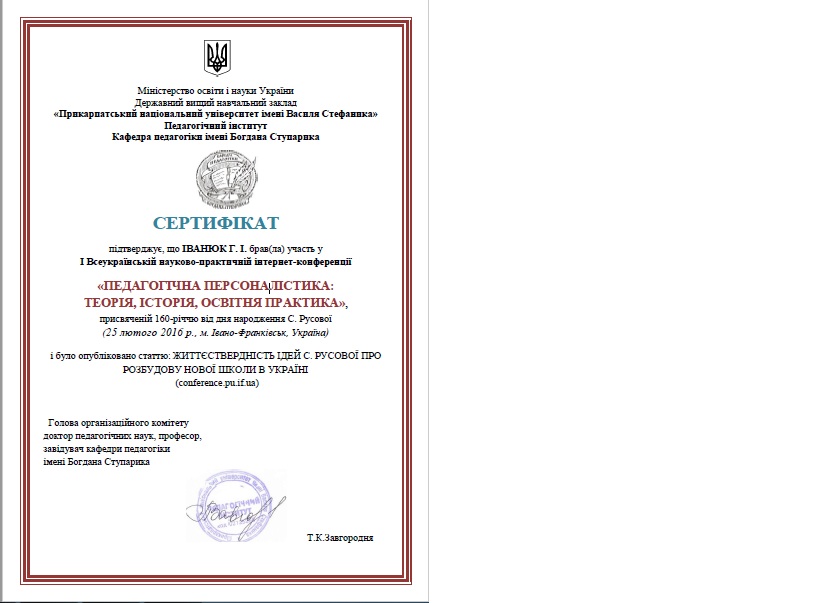 | 245 | Педагогічна персоналістика: теорія, історія, освітня практика | Життєствердність ідей С. Русової про розбудову нової школи в Україні | ДВНЗ 'Прикарпатський національний університет імені Василя Стефаника' |