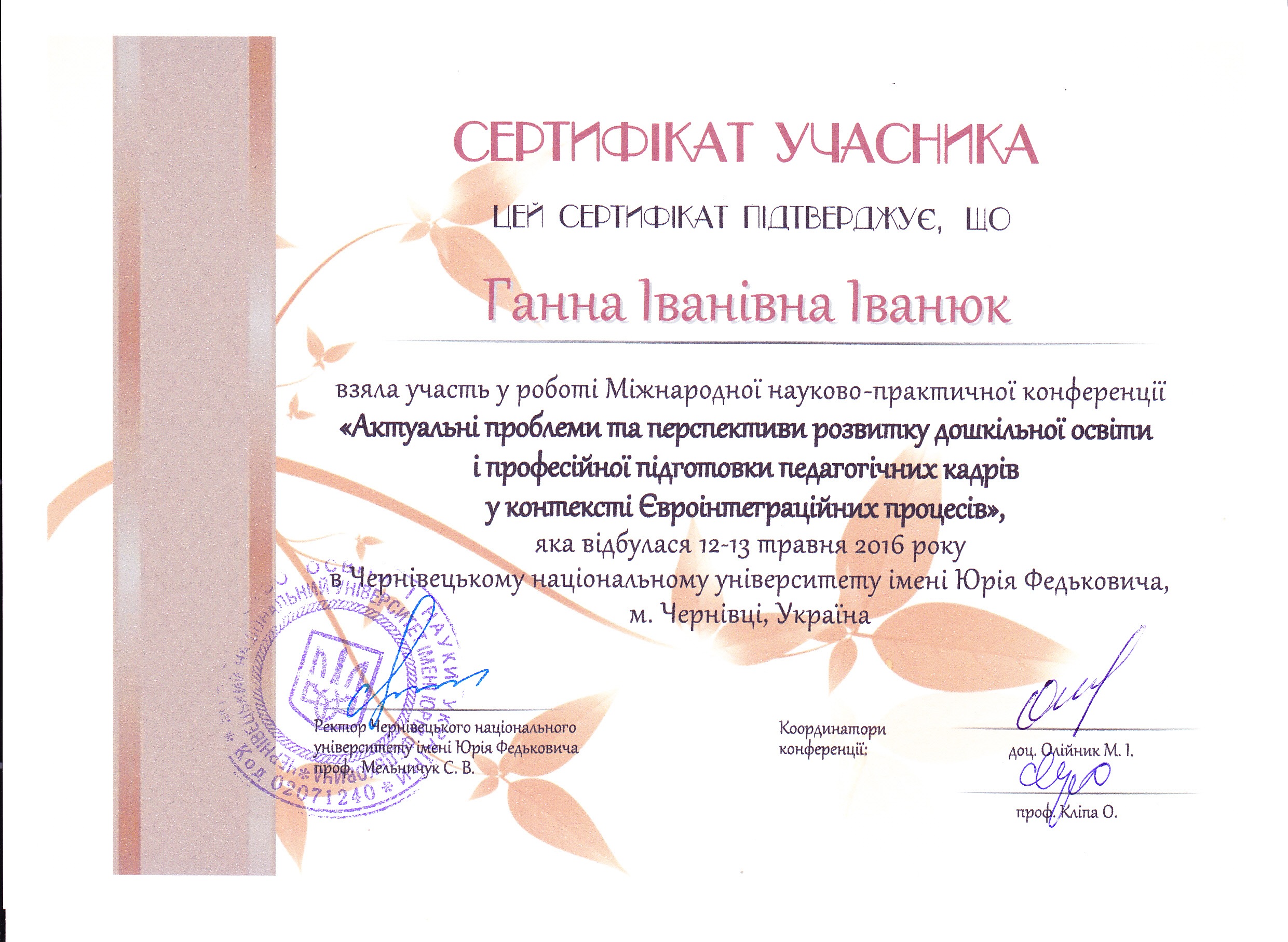 | 248 | Актуальні проблеми та перспективи розвитку дошкільної освіти і професійної підготовки педагогічних кадрів у контексті євроінтеграційних процесів | Підготовка фахівців із дошкільної освіти: навчання на дослідженнях | Чернівецький національний університет імені Юрія Федьковича |