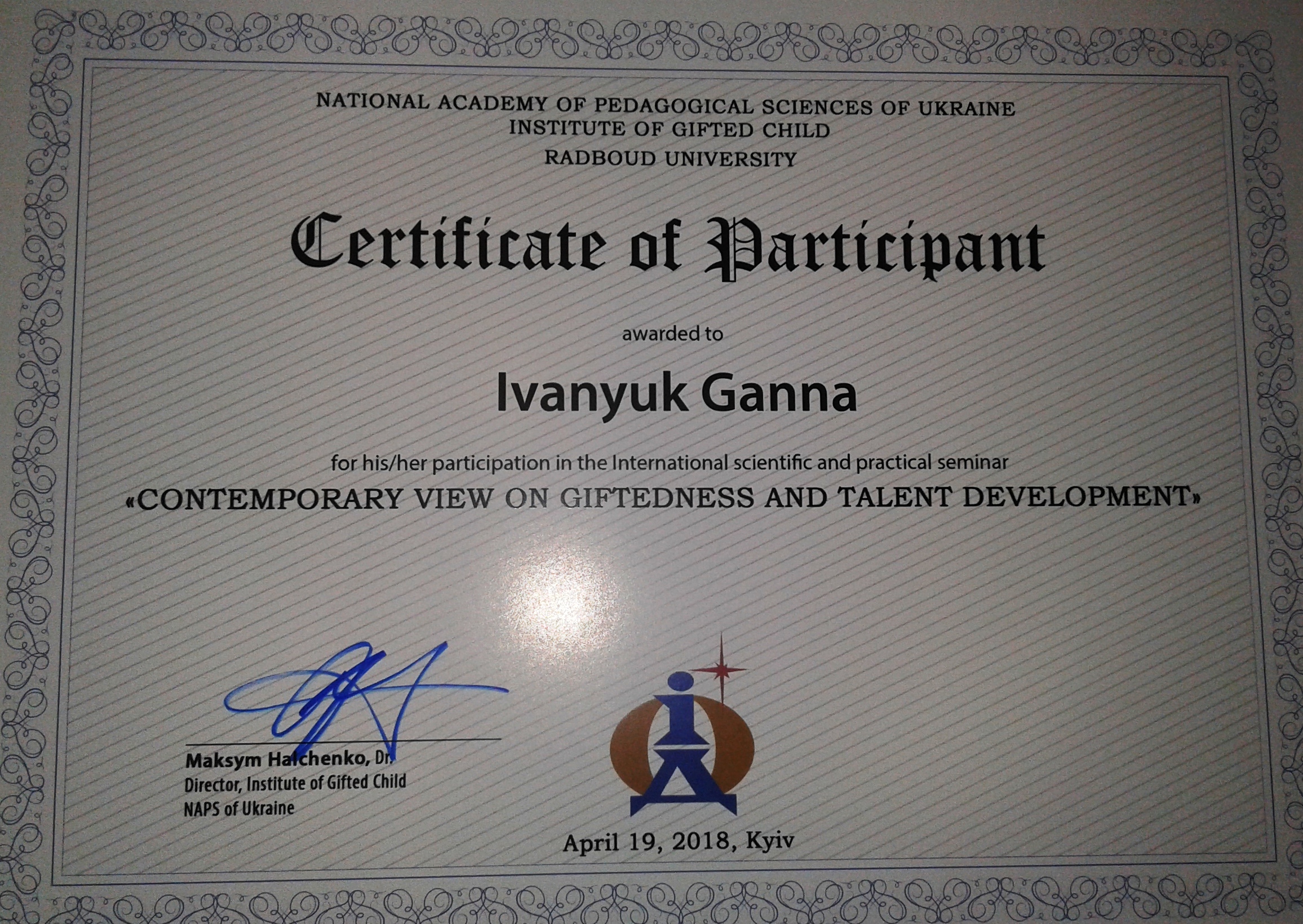 | 3116 | International scientific and practical seminar «CONTEMPORARY VIEW ON GIFTEDNESS AND TALENT DEVELOPMENT» | - | NATIONAL ACADEMY OF PEDAGOGICAL SCIENCES OF UKRAINE INSTITUTE OF GIFTED CHILD RADBOUD UNIVERSITY |