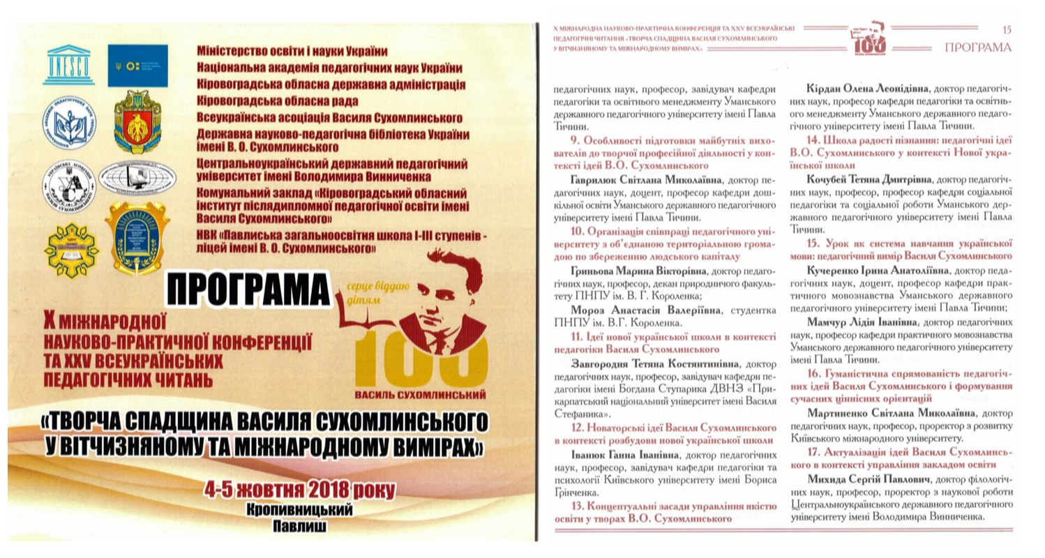 | 3297 | Х Міжнародна науково-практична конференція та ХХV Всеукраїнські педагогічні читання "Творча спадщина Василя Сухомлинського у вітчизняному та міжнародному вимірах" | Новаторські ідеї Василя Сухомлинського в контексті розбудови нової української школи | Кропивницький - Павлиш |