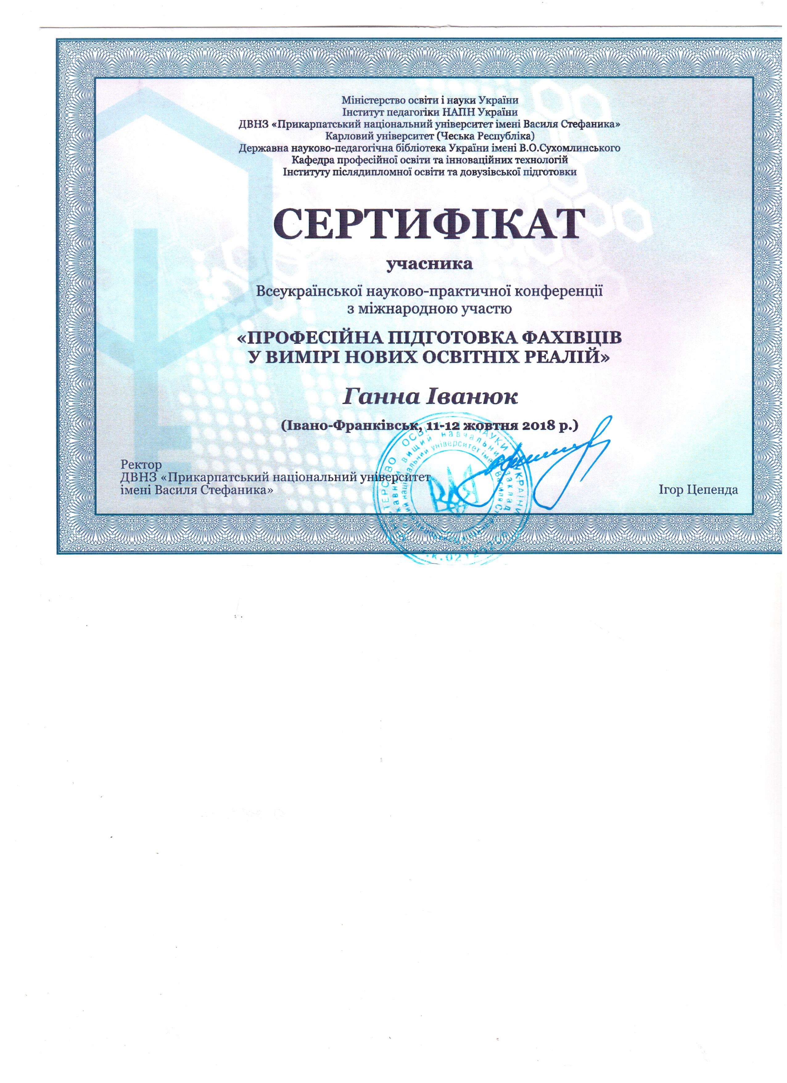| 3349 | Всеукраїнська науково-практична конференція з міжнародною участю "Професійна підготовка фахівців у вимірі нових освітніх реалій" | Реалізація нової освітньої стратегії психолого-педагогічної підготовки фахівців в умовах реформування системи освіти в Україні | м. Івано-Франківськ |