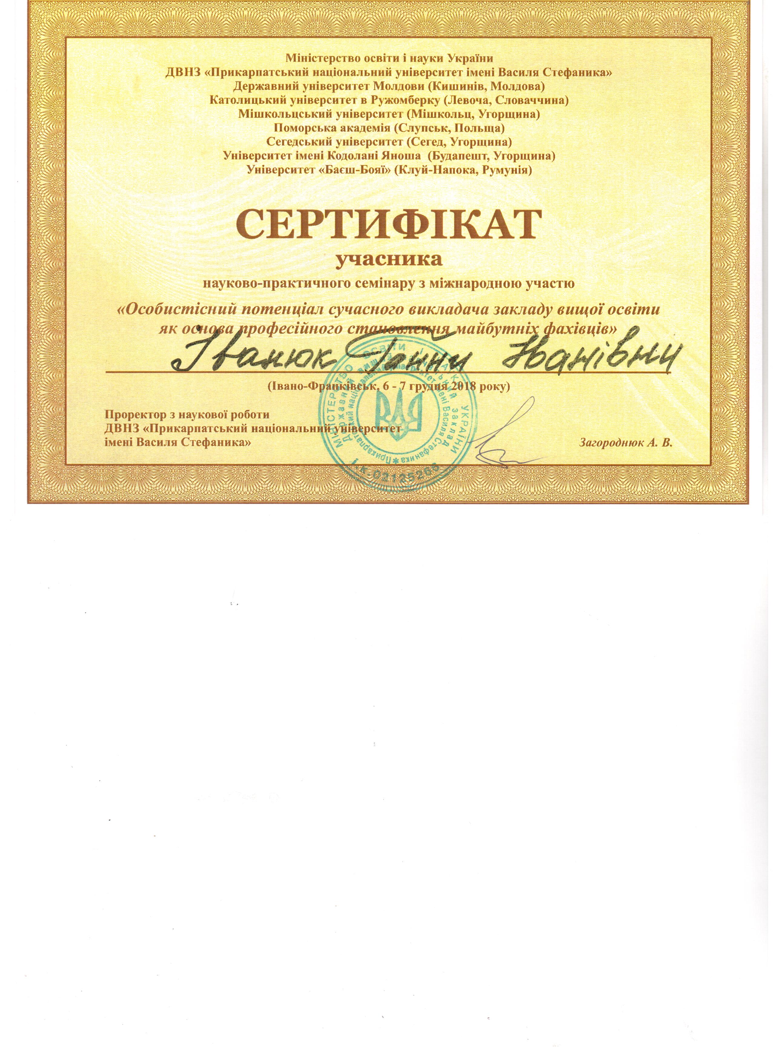 | 3724 | Науково-практичний семінар з міжнародною участю "Особистісний потенціал сучасного викладача закладу вищої освіти як основа професійного становлення | Нова стратегія підготовки педагога: ціннісний вимір | Івано-Франківськ |