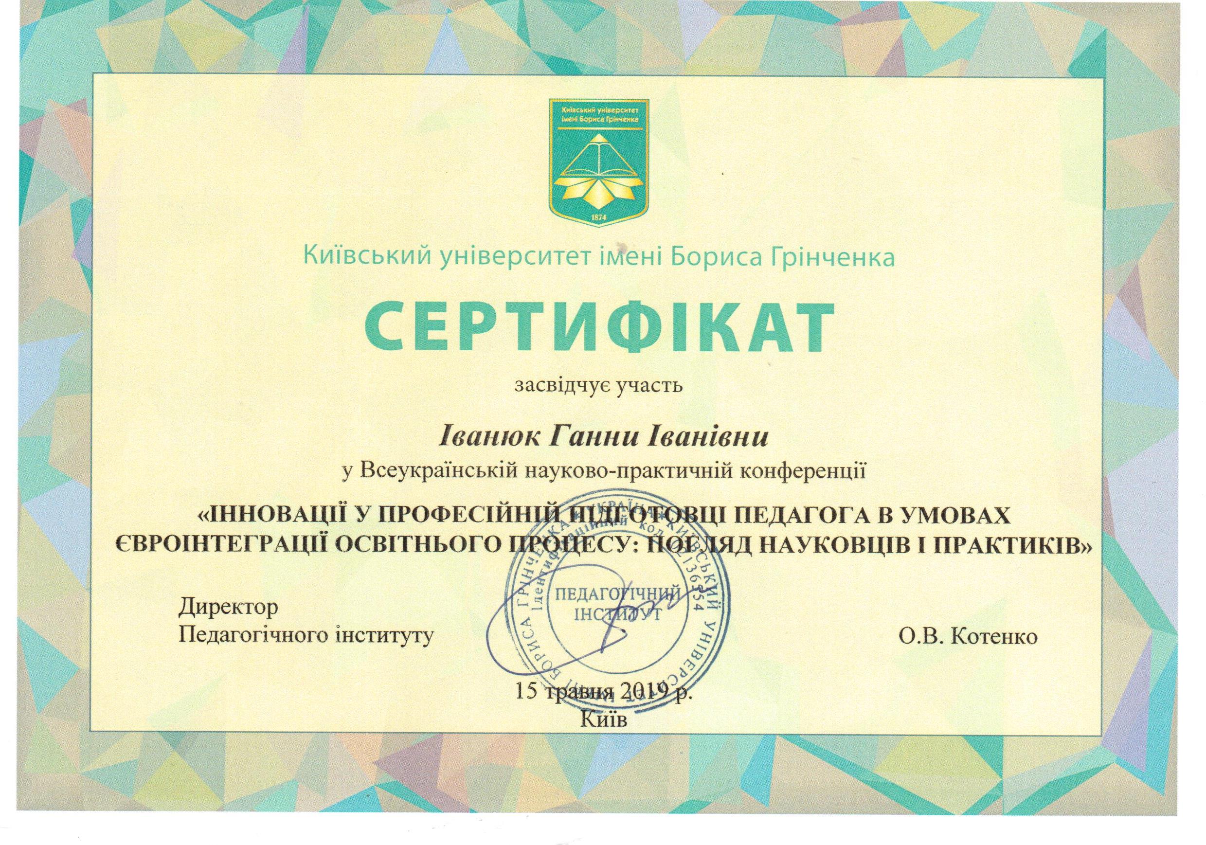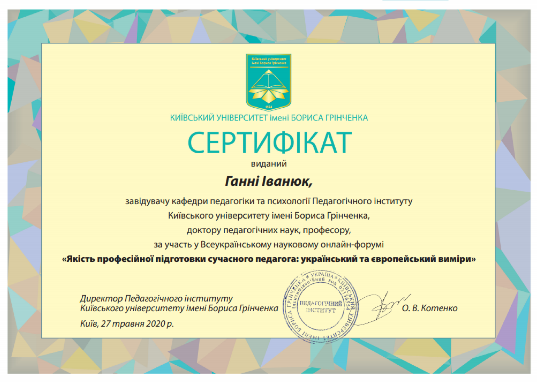 | 5373 | Всеукраїнський науковий онлайн-форум "Якість професійної підготовки сучасного педагога: український та європейський виміри" | Якість особистісно-професійної підготовки педагога як соціально-культурний феномен | Педагогічний інститут Київського університету імені Бориса Грінченка |