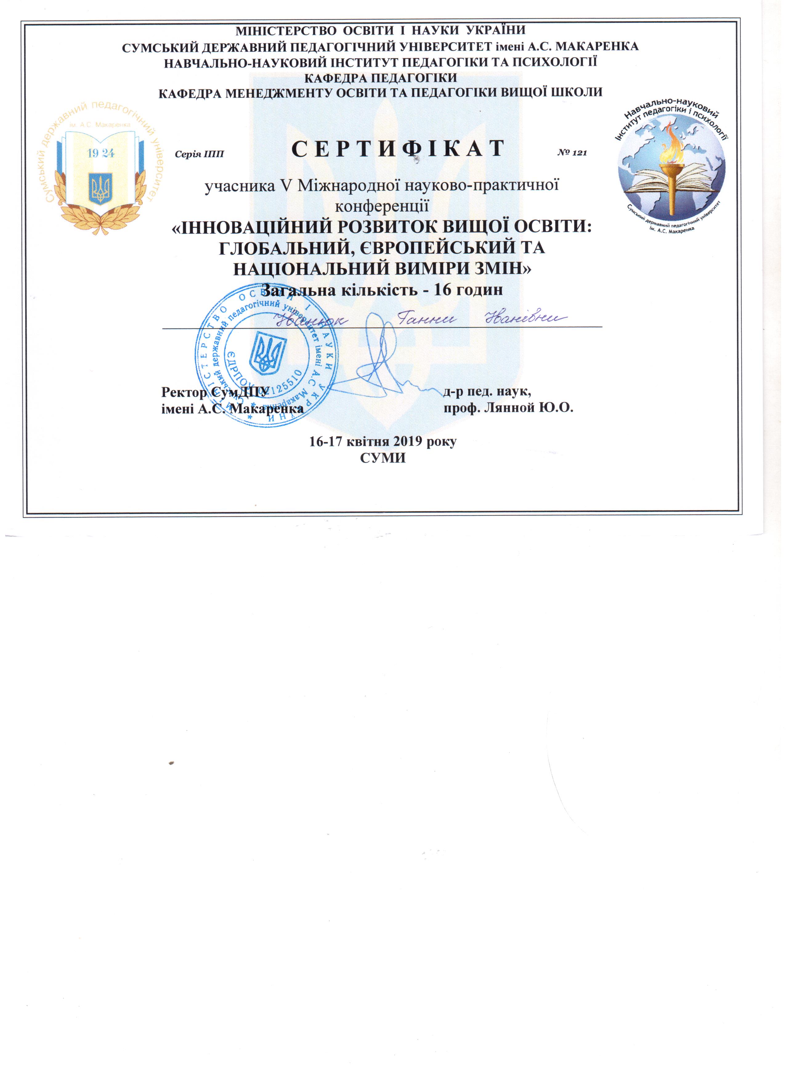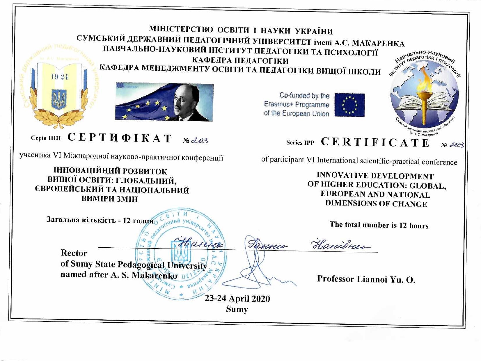| 5504 | VI Міжнародна науково-практична конференція "Інноваційний розвиток вищої освіти: глобальний, європейський та національний виміри змін" | Антропологічна стратегія підготовки педагогів в Україні та ЄС: компаративні студії | Сумський державний педагогічний університет імені А.С. Макаренка |