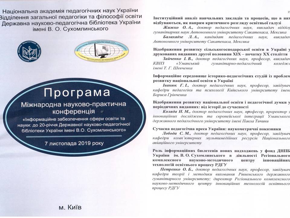 | 4456 | Міжнародна науково-практична конференція "Інформацйне забезпечення сфери освіти: до 20-річчя Державної науково-педагогічної бібліотеки України імені В.О. Сухомлинського" | Інформаційне середовище історико-педагогічних студій із проблем розвитку національної освіти України | Державна науково-педагогічна бібліотека України імені В.О. Сухомлинського |