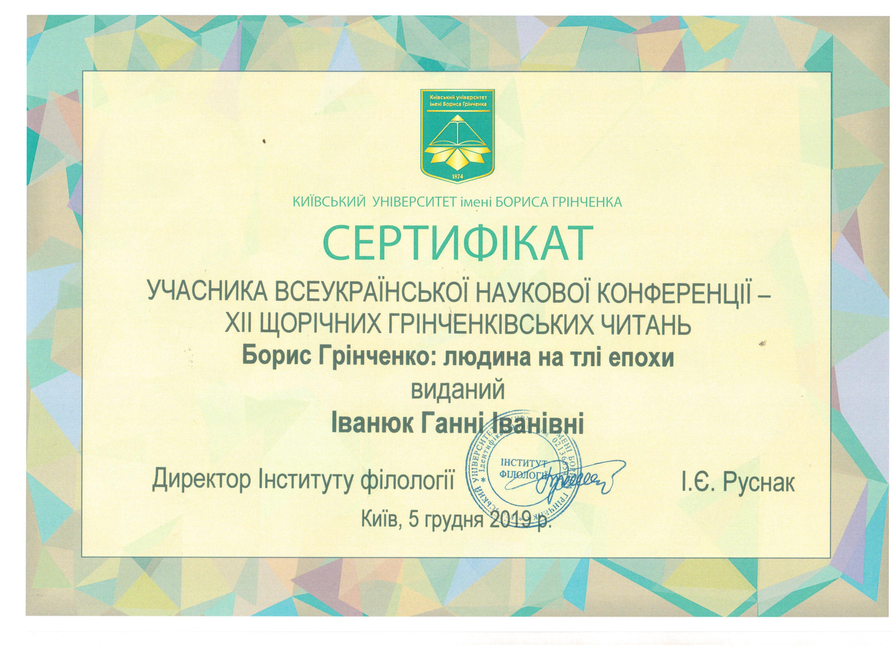 | 5012 | Всеукраїнська наукова конференція - ХІІ Грінченківських читань "Борис Грінченко: людина на тлі епохи" | Постать Бориса Грінченка у спогадах його учнів | Київський університет імені Бориса Грінченка |