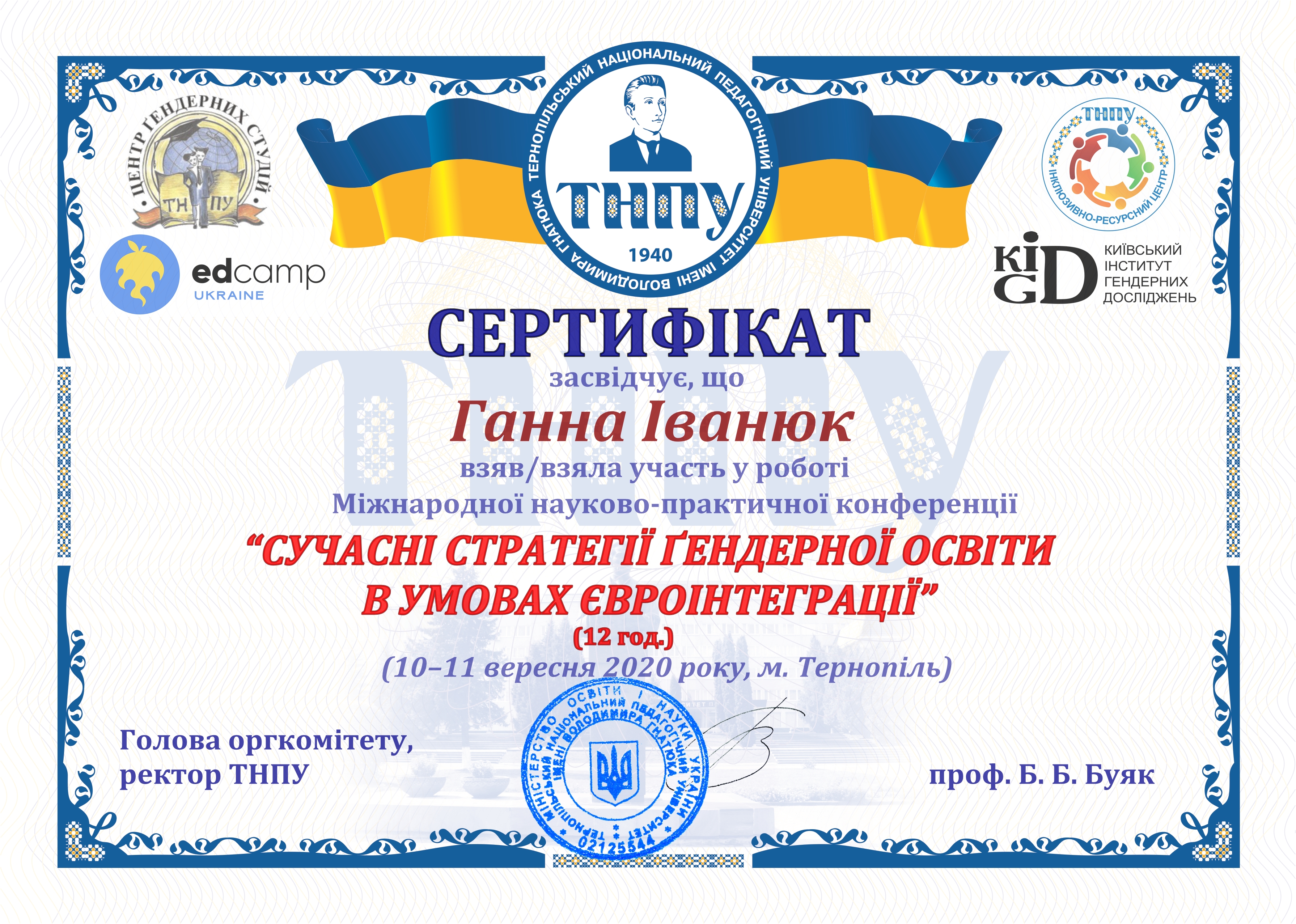 | 5471 | Міжнародна науково-практична конференція"СУЧАСНІ СТРАТЕГІЇ ҐЕНДЕРНОЇ ОСВІТИ В УМОВАХ ЄВРОІНТЕГРАЦІЇ" | Підготовка педагога Нової української школи: ґендерний аспект | Тернопіль |