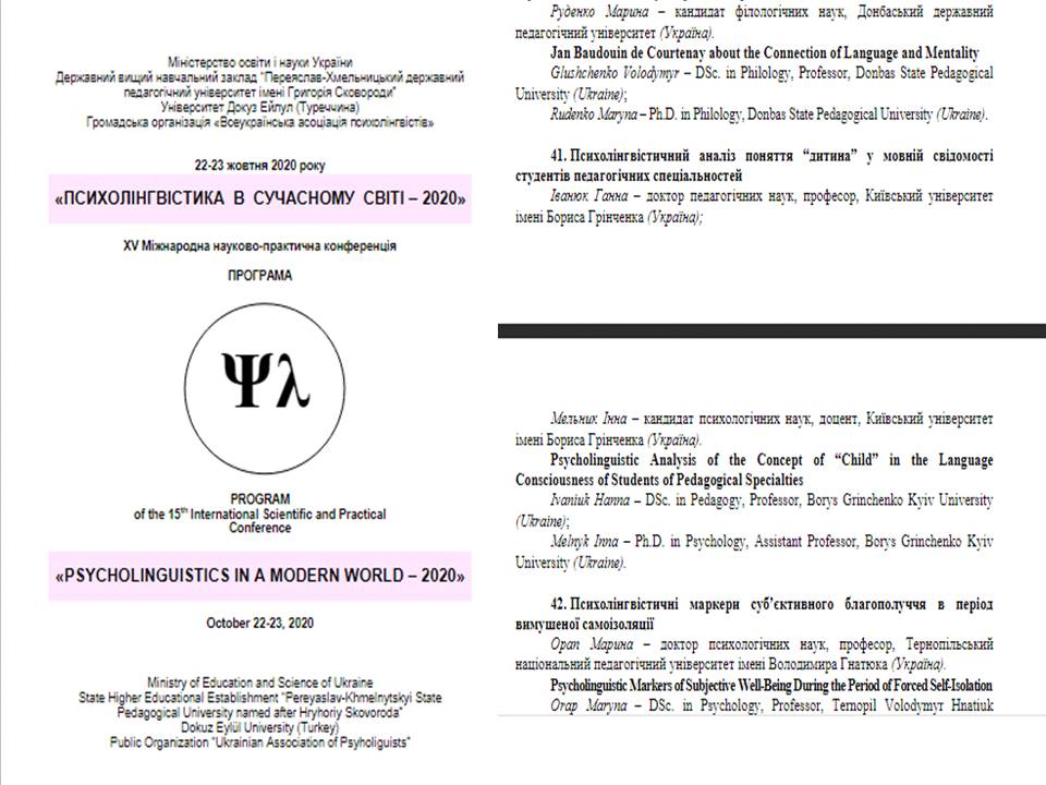 | 6354 | XV Міжнародна науково-практична Інтернет-конференція «ПСИХОЛІНГВІСТИКА В СУЧАСНОМУ СВІТІ - 2020» | Психолінгвістичний аналіз поняття “дитина”у мовній свідомості студентів педагогічних спеціальностей | Переяслав-Хмельницький |