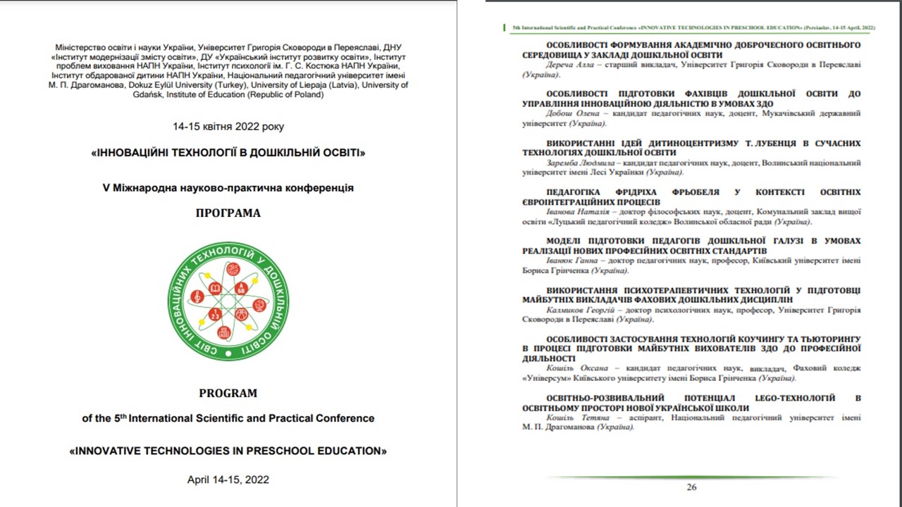 | 7962 | V Міжнародна науково-практична конференція «ІННОВАЦІЙНІ ТЕХНОЛОГІЇ В ДОШКІЛЬНІЙ ОСВІТІ» | МОДЕЛІ ПІДГОТОВКИ ПЕДАГОГІВ ДОШКІЛЬНОЇ ГАЛУЗІ В УМОВАХ РЕАЛІЗАЦІЇ НОВИХ ПРОФЕСІЙНИХ ОСВІТНІХ СТАНДАРТІВ | Переяслав |