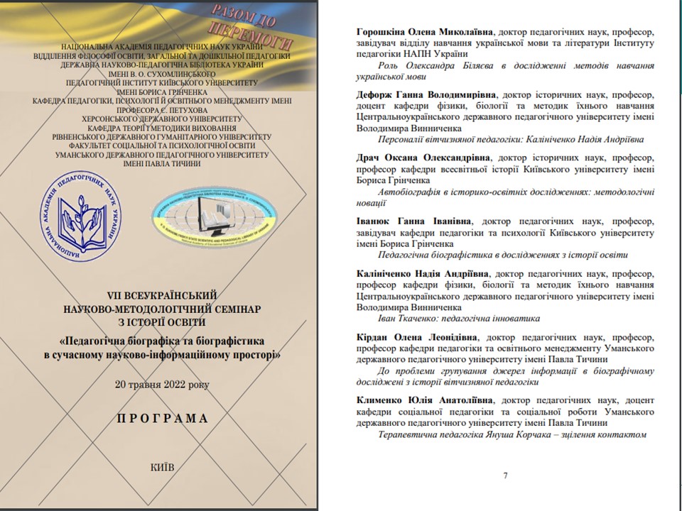 | 8004 | VІІ ВСЕУКРАЇНСЬКИЙ НАУКОВО-МЕТОДОЛОГІЧНИЙ СЕМІНАР З ІСТОРІЇ ОСВІТИ «Педагогічна біографіка та біографістика в сучасному науково-інформаційному просторі» | Педагогічна біографістика в дослідженнях з історії освіти | Державна науково-педагогічна бібліотека України імені В.О. Сухомлинського |