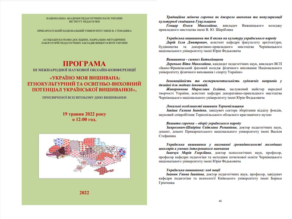 | 8020 | ІІІ МІЖНАРОДНА НАУКОВА ОНЛАЙН-КОНФЕРЕНЦІЇ «УКРАЇНО МОЯ ВИШИВАНА: ЕТНОКУЛЬТУРНИЙ ТА ОСВІТНЬО-ВИХОВНИЙ ПОТЕНЦІАЛ УКРАЇНСЬКОЇ ВИШИВАНКИ» | Українська вишиванка: код нації | ПРИКАРПАТСЬКИЙ НАЦІОНАЛЬНИЙ УНІВЕРСИТЕТ ІМЕНІ В. СТЕФАНИКА |