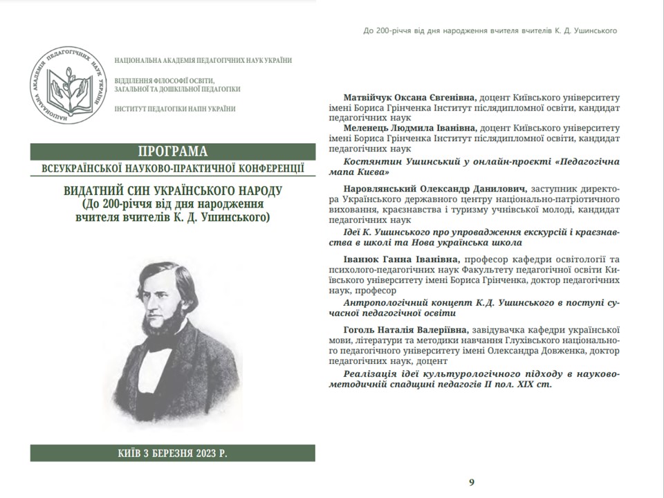 | 8929 | ВИДАТНИЙ СИН УКРАЇНСЬКОГО НАРОДУ (До 200-річчя від дня народження вчителя вчителів К. Д. Ушинського) | Антропологічний концепт К.Д. Ушинського в поступі сучасної педагогічної освіти | Національна академія педагогічних наук України |