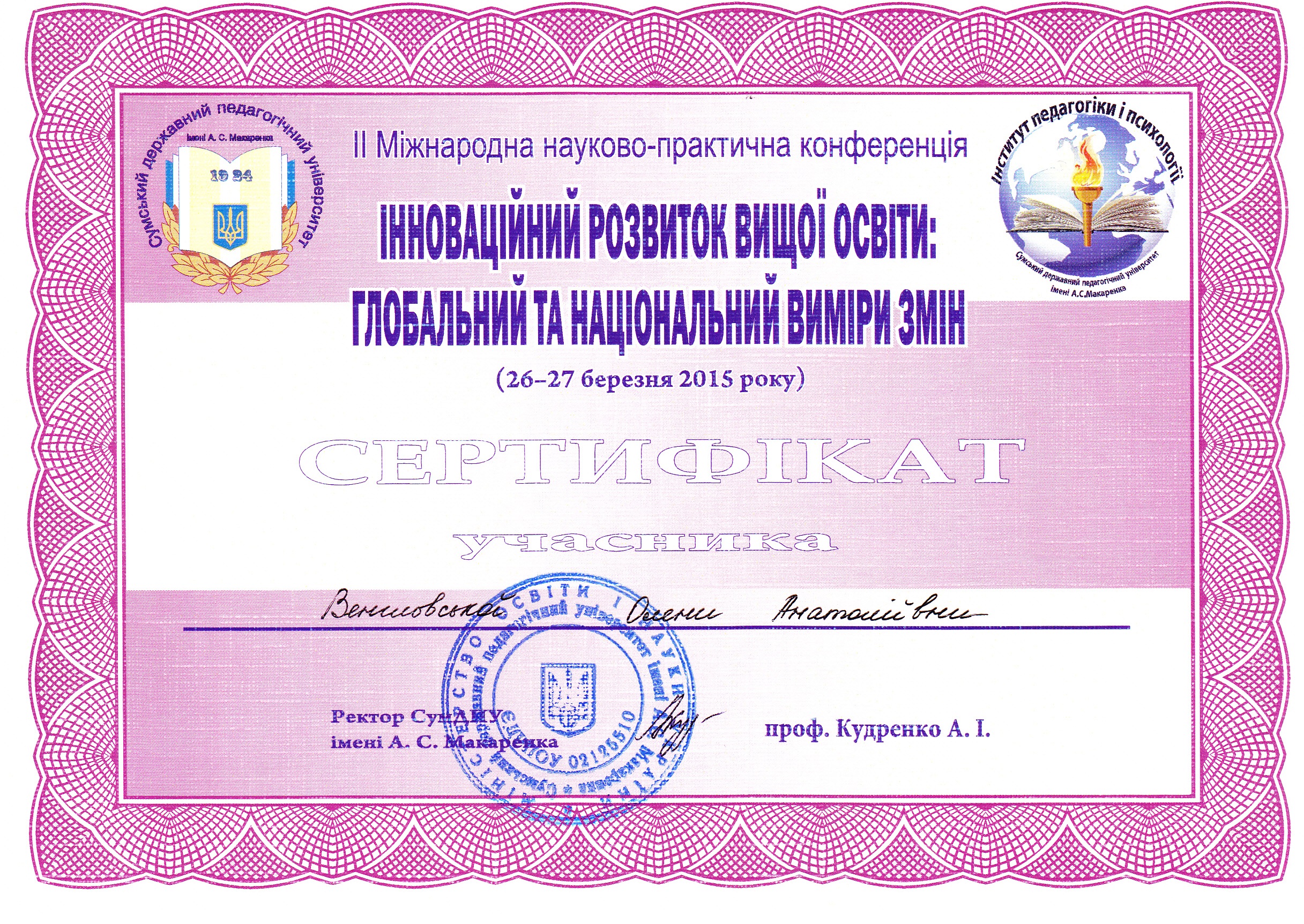| 4300 | V Міжнародна науково-практична конференція "Інноваційний розвиток вищої освіти: глобальний, європейський та національний виміри змін" | Використання Інтернет-ресурсів в особистісно-професійному розвитку майбутніх педагогів | Сумський державний педагогічний університет імені А.С. Макаренка |