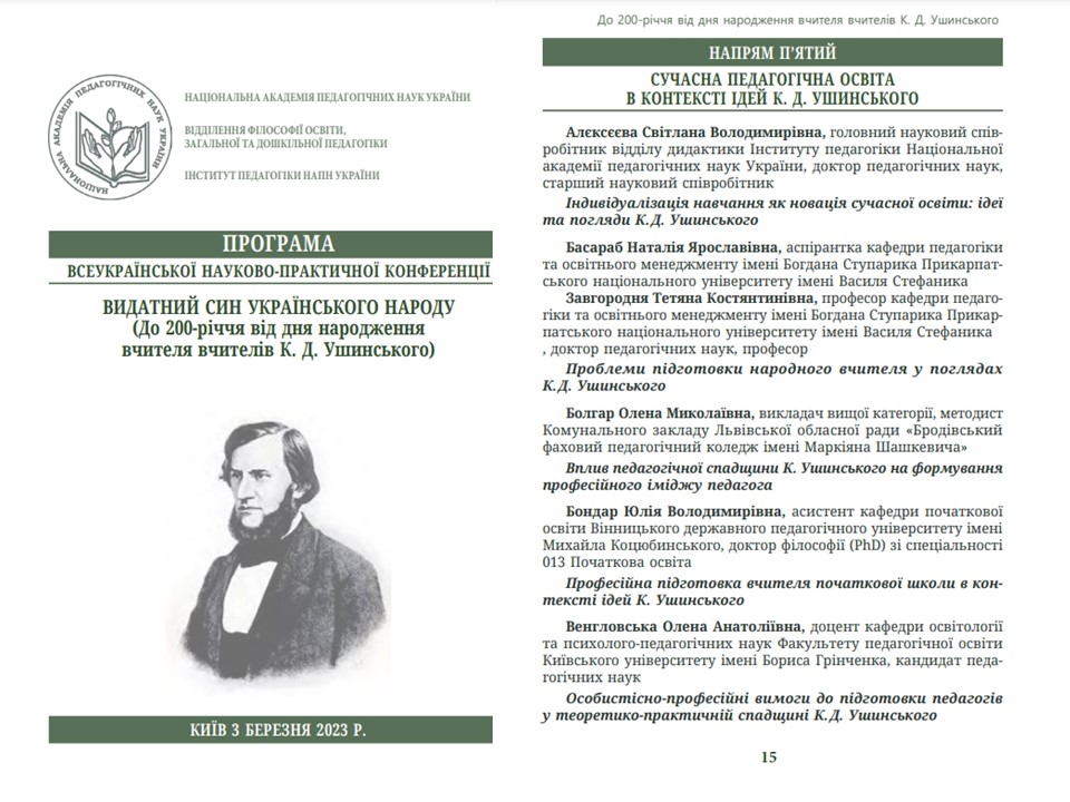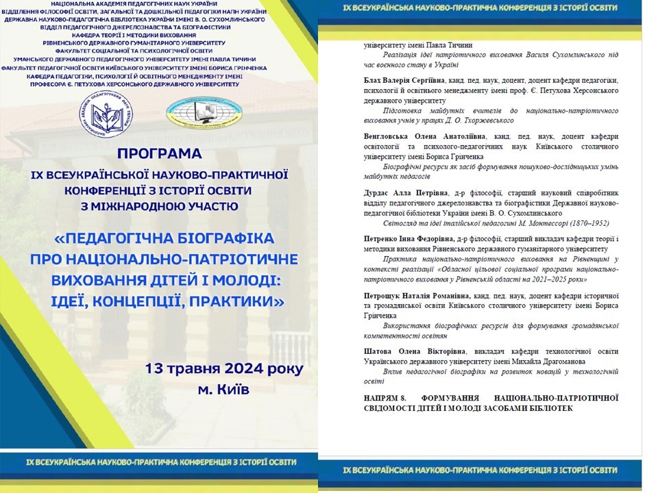| 9198 | VІІІ ВСЕУКРАЇНСЬКА НАУКОВО-ПРАКТИЧНА КОНФЕРЕНЦІЯ З ІСТОРІЇ ОСВІТИ З МІЖНАРОДНОЮ УЧАСТЮ «Педагогічна біографіка в освітньо-науковому просторі в умовах воєнної доби: нові виклики і завдання» | Історико-педагогічні студії – дослідницький майданчик з вивчення історико-освітніх феноменів для майбутніх педагогів | Державна науково-педагогічна бібліотека України імені В.О. Сухомлинського | document.pdf | |