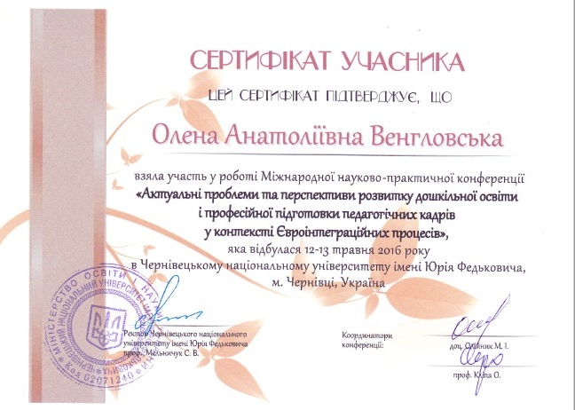 | 104 | Актуальні проблеми та перспективи розвитку дошкільної освіти і професійної підготовки педагогічних кадрів у контексті євроінтеграційних процесів | Розвиток дошкільної освіти в Незалежній Україні (кінець ХХ - початок ХХІ століття) | Чернівецький національний університет імені Юрія Федьковича |