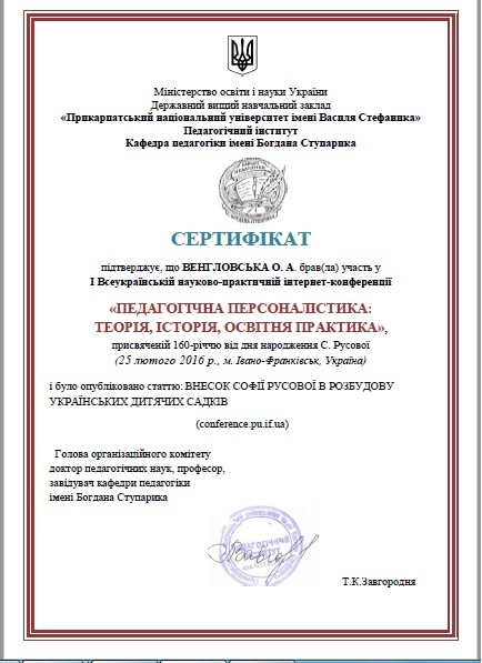 | 106 | І Всеукраїнська науково-практична інтернет-конференція «Педагогічна персоналістика: теорія, історія, освітня практика» | Внесок Софії Русової у розбудову українських дитячих садків | ДВНЗ «Прикарпатський національний університет імені Василя Стефаника» |