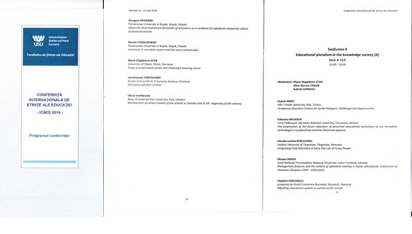 | 108 | Conferinta internationala de Stiinte ale Educftiei | Development of variant models of pre-school in Ukraine (end of XX - beginning of XXI centery) | Universitate Stefan cel Mare Suceava |