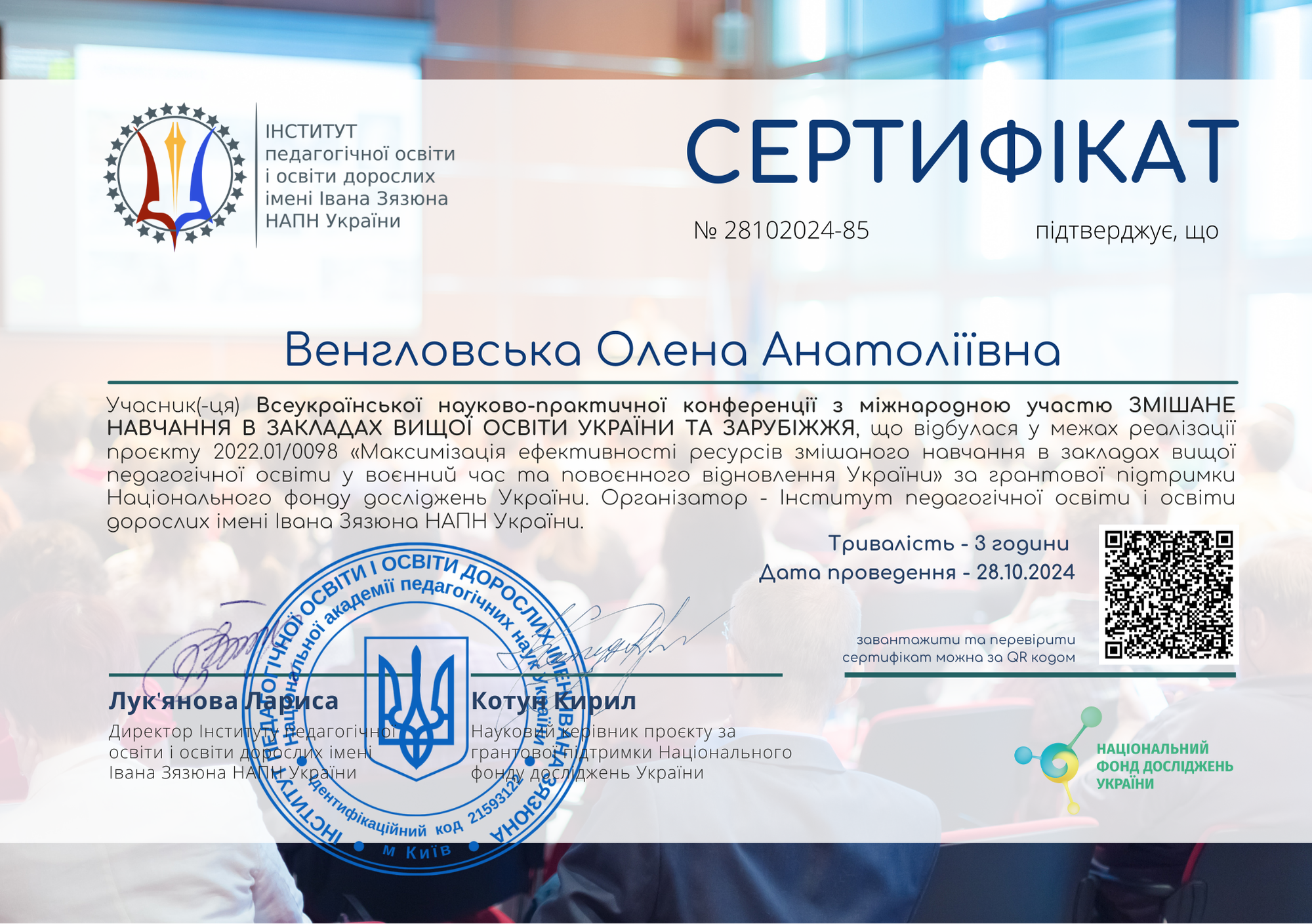 | ID | Назва | Тема доповіді | Місце проведення | Документ, що засвідчує | Дата проведення |