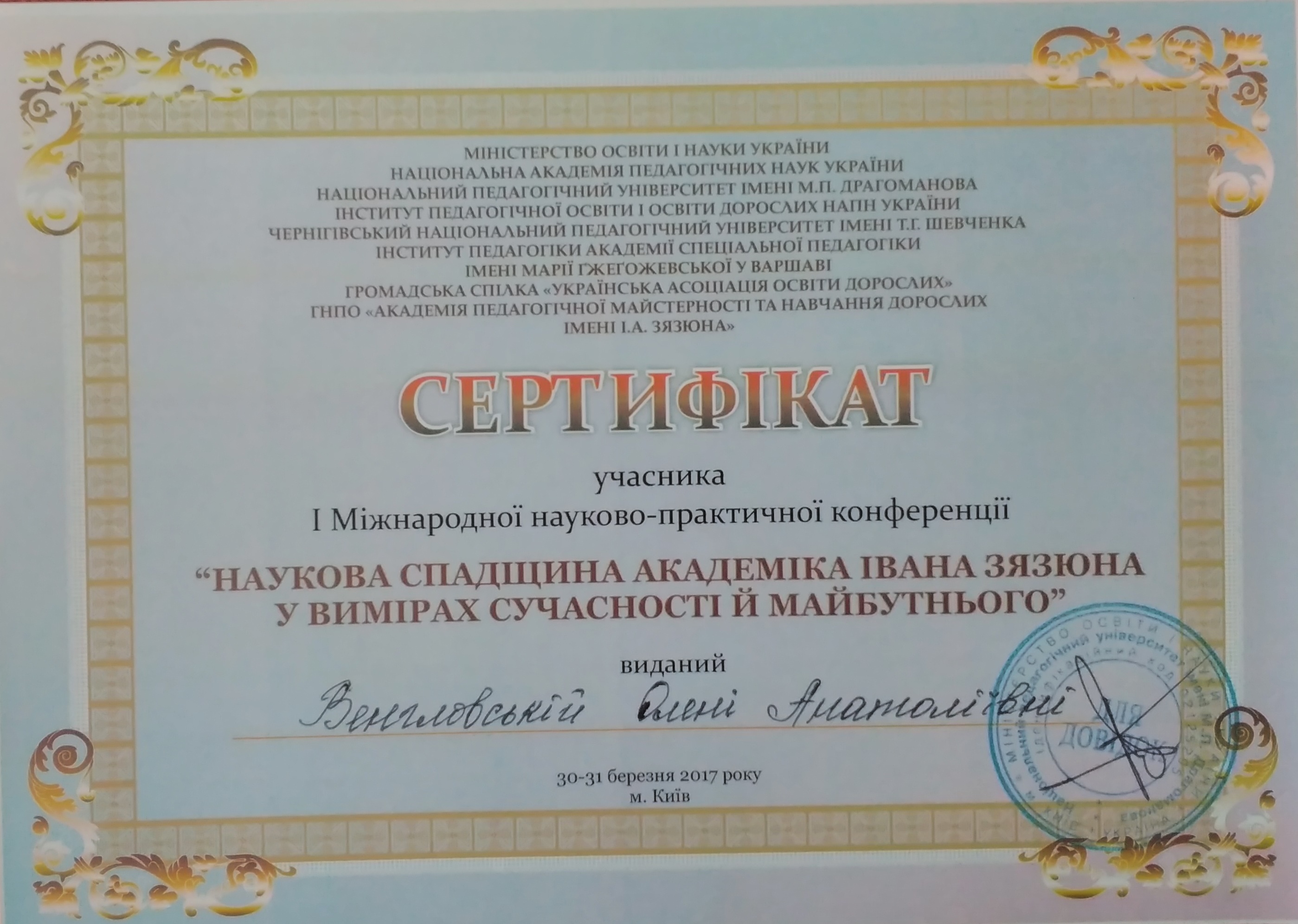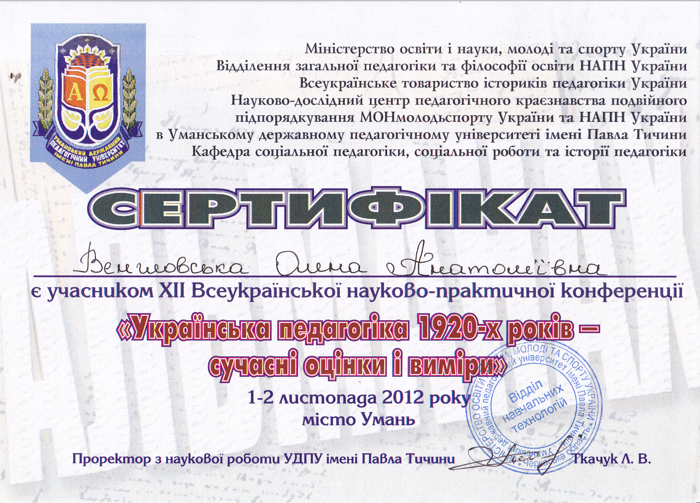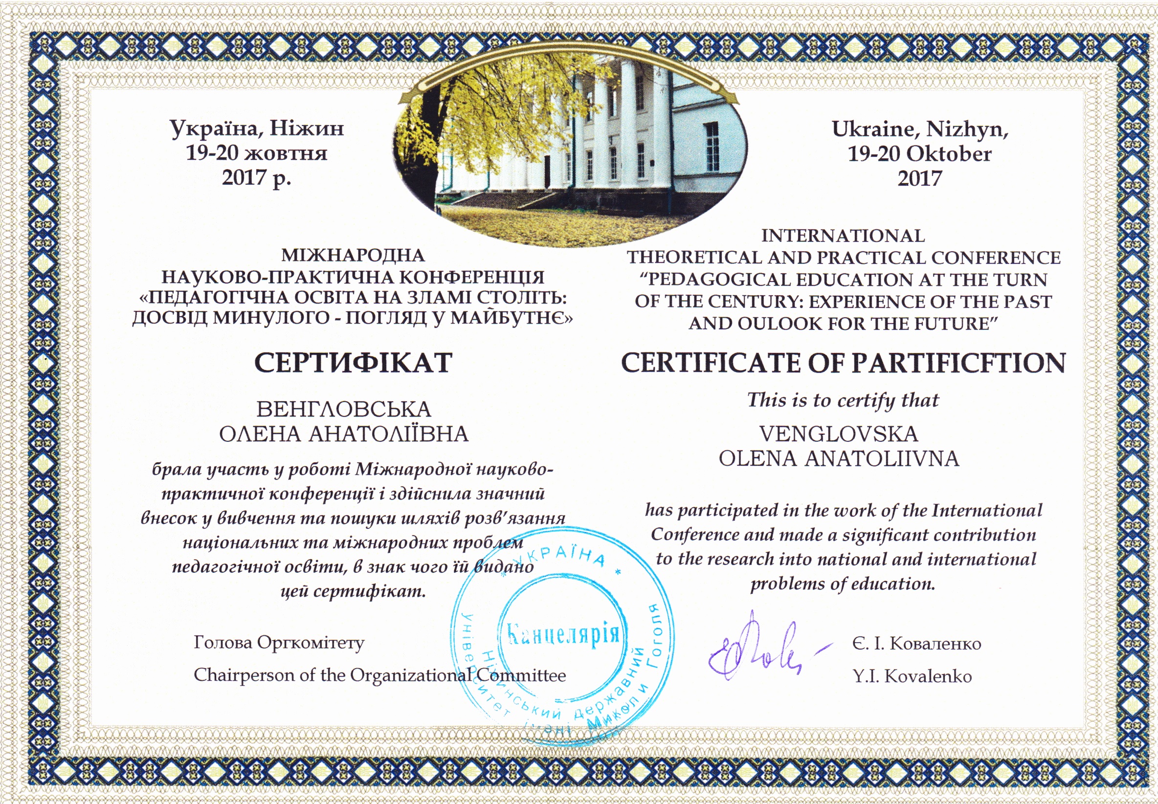 | 2000 | Міжнародна науково-практична конференція \ | Становлення і розвиток педагогічної освіти в Україні в історико-педагогічній ретроспективі ХХ століття | Ніжинський державний університет імені Миколи Гоголя |