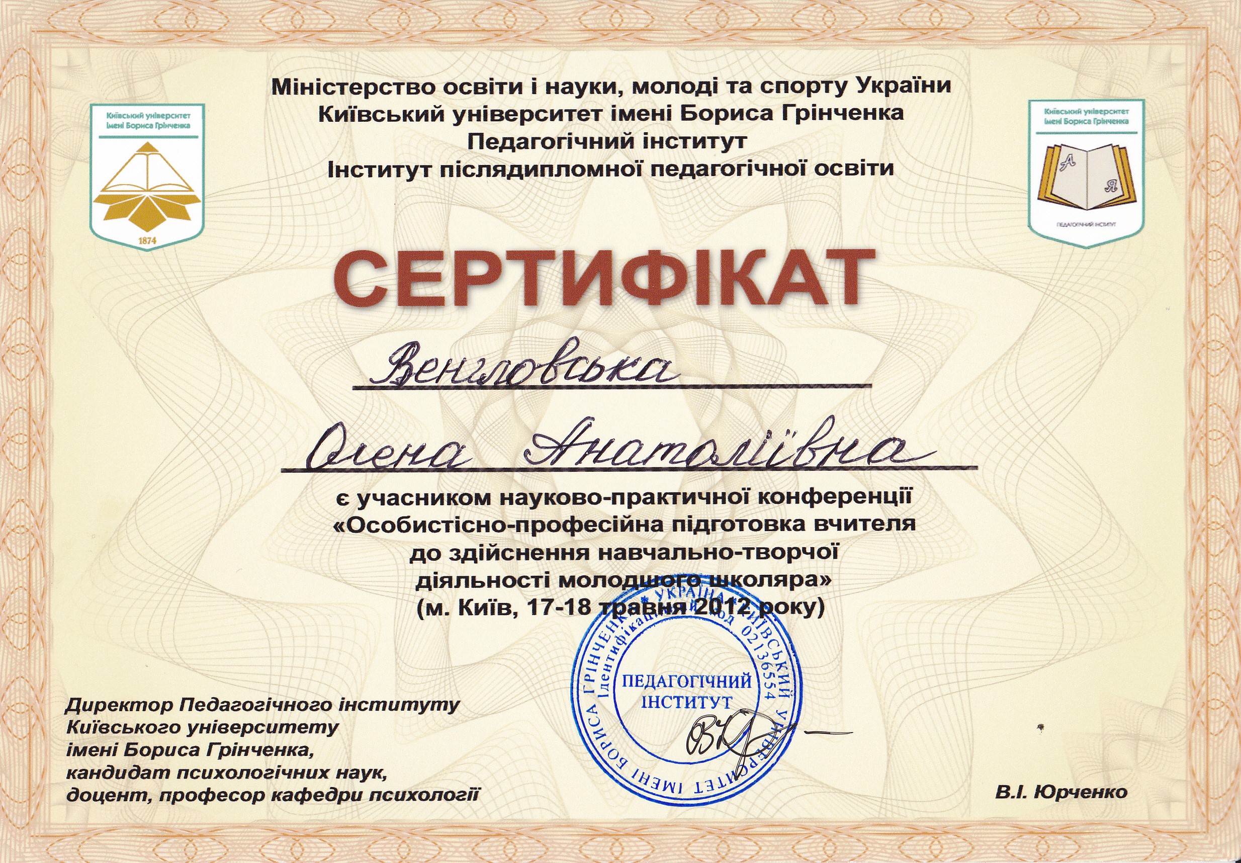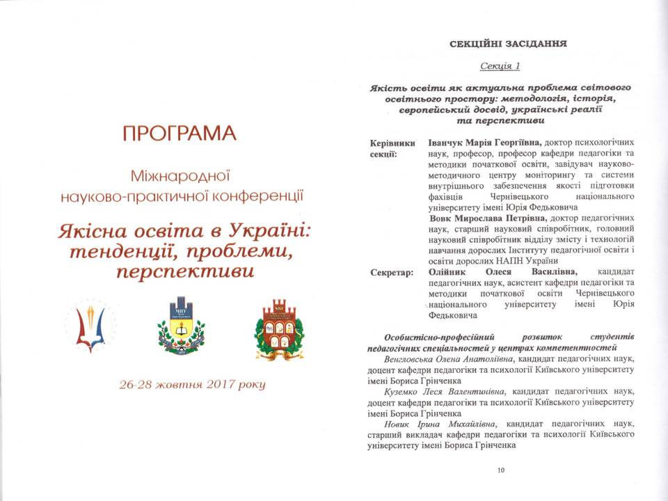 | 2002 | Міжнародна науково-практична конференція" Якісна освіта в Україні : тенденції, проблеми, перспективи" | Особистісно-професійний розвиток студентів педагогічних спеціальностей у центрах компетентностей | Чернівецький національний університет імені Юрія Федьковича |