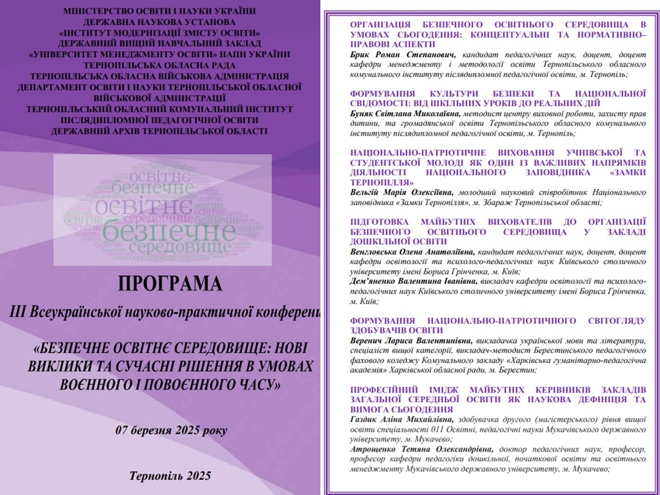 | 11845 | ІІІ Всеукраїнська науково-практична конференція "Безпечне освітнє середовище: нові виклики та сучасні рішення в умовах воєнного і повоєнного часу" | ПІДГОТОВКА МАЙБУТНІХ ВИХОВАТЕЛІВ ДО ОРГАНІЗАЦІЇ БЕЗПЕЧНОГО ОСВІТНЬОГО СЕРЕДОВИЩА У ЗАКЛАДІ ДОШКІЛЬНОЇ ОСВІТИ | Тернопільський обласний комунальний інститут післядипломної педагогічної освіти |