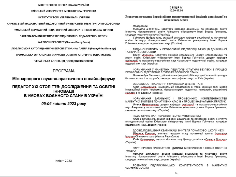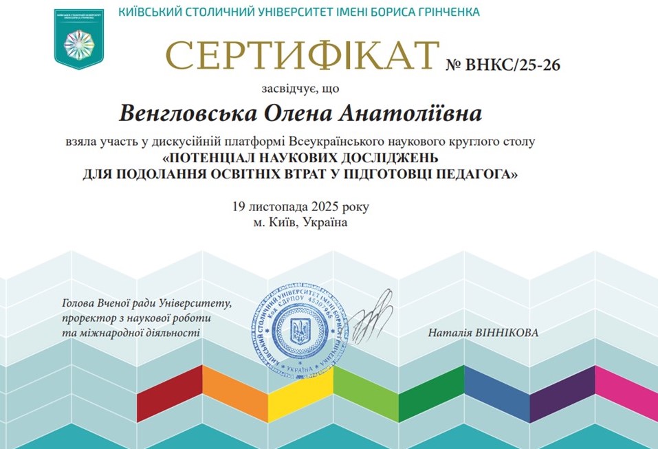 | 12796 | Всеукраїнський науковий круглий стіл "ПОТЕНЦІАЛ НАУКОВИХ ДОСЛІДЖЕНЬ ДЛЯ ПОДОЛАННЯ ОСВІТНІХ ВТРАТ У ПІДГОТОВЦІ ПЕДАГОГА" | Портфоліо особистісно-професійного зростання майбутніх педагогів як інструмент діагностики й розвитку внутрішньої мотивації до подолання освітніх втрат | Київський столичний університет імені Бориса Грінченка |
