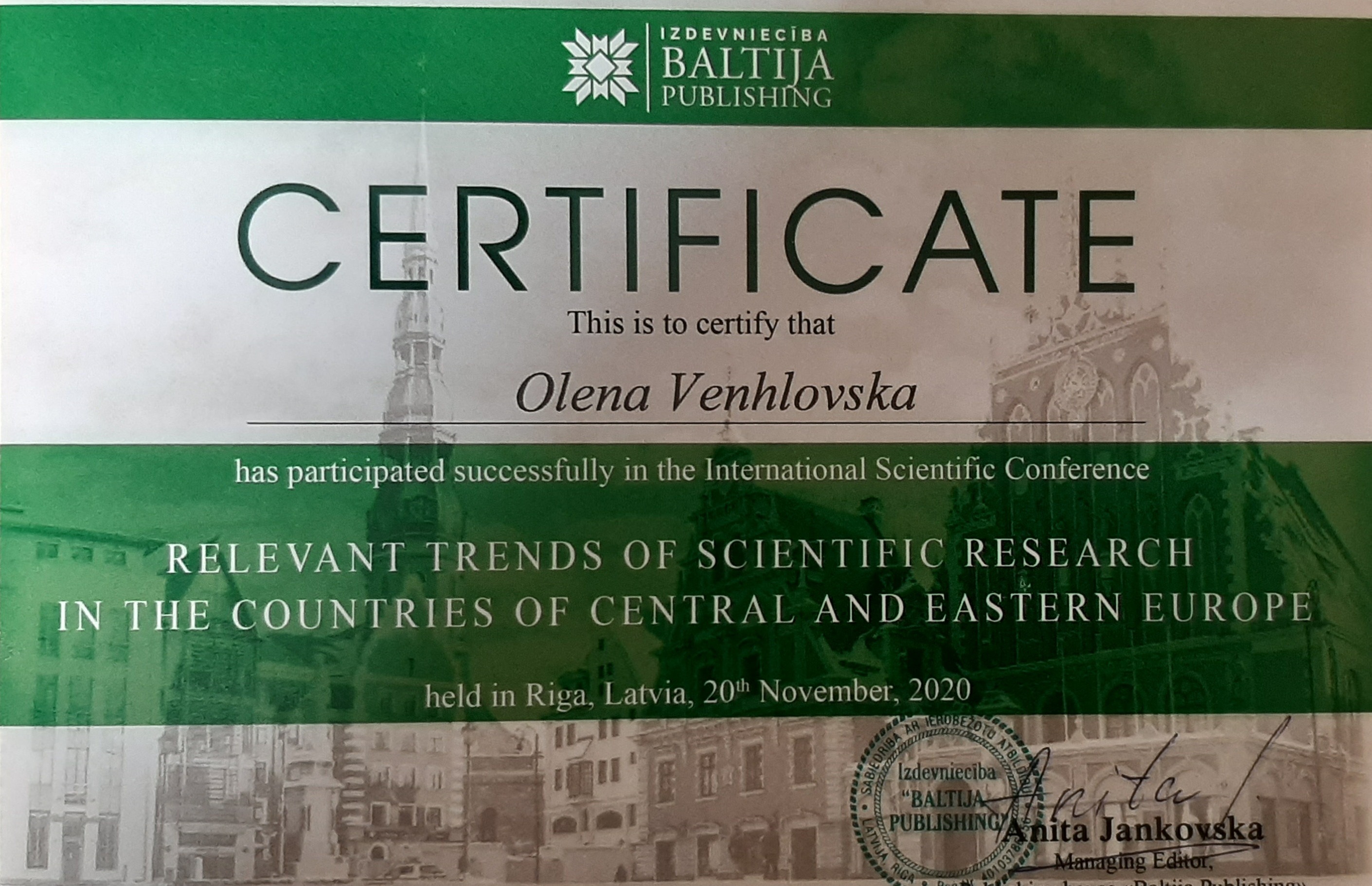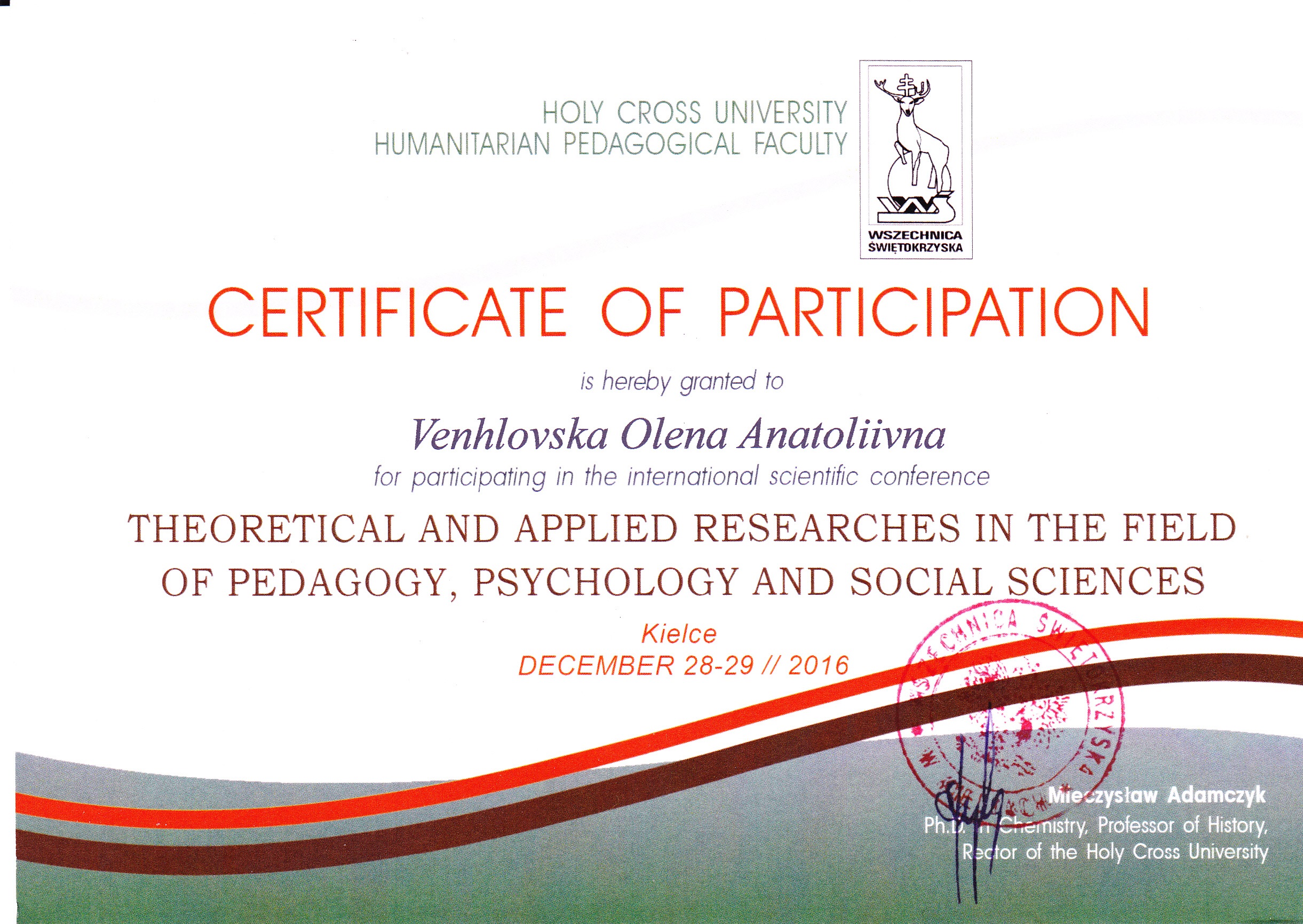 | 1500 | Theoretical and applied researches in the field of pedagogy, psychology and social sciences | Розвиток ідей дитиноцентризму в педагогічній думці України (кінець ХІХ - 20-ті рр. ХХ століття) | Holy cross university Humanitarian pedagogical faculty |