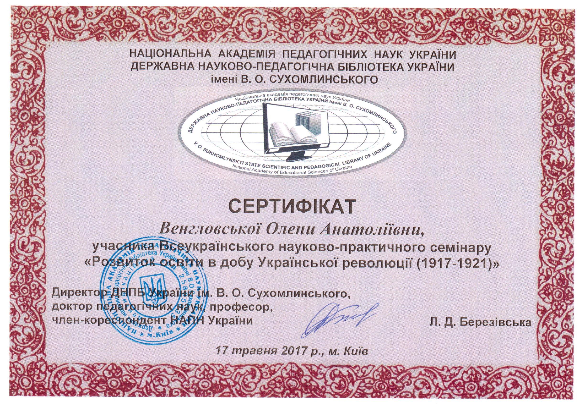 | 1653 | Всеукраїнський науково-практичний семінар "Розвиток освіти в добу Української революції (1917-1921)" | Особливості вивчення освіти доби Української революції в змісті підготовки майбутніх педагогів | Державна науково-педагогічна бібліотека України імені В.О. Сухомлинського |