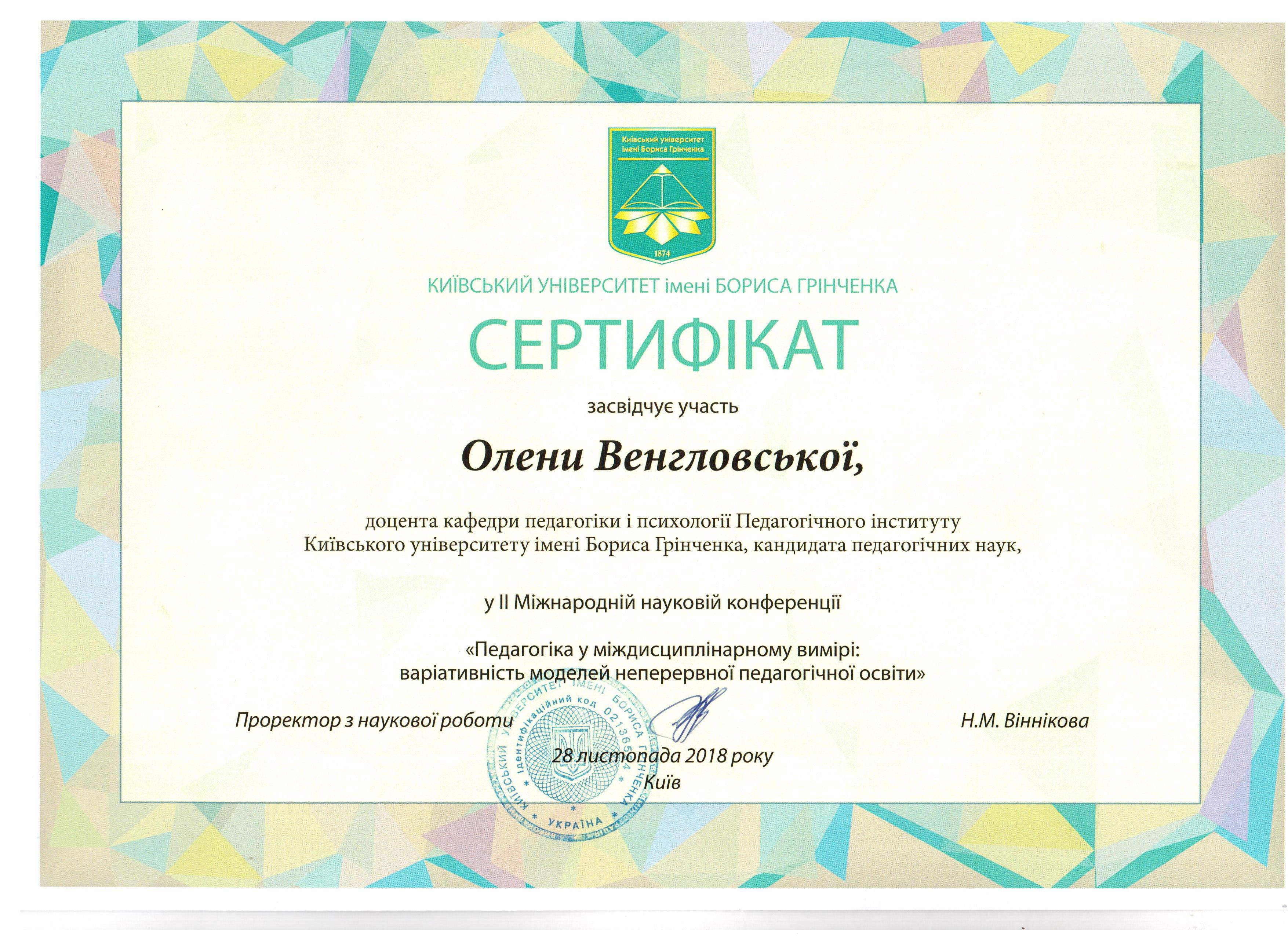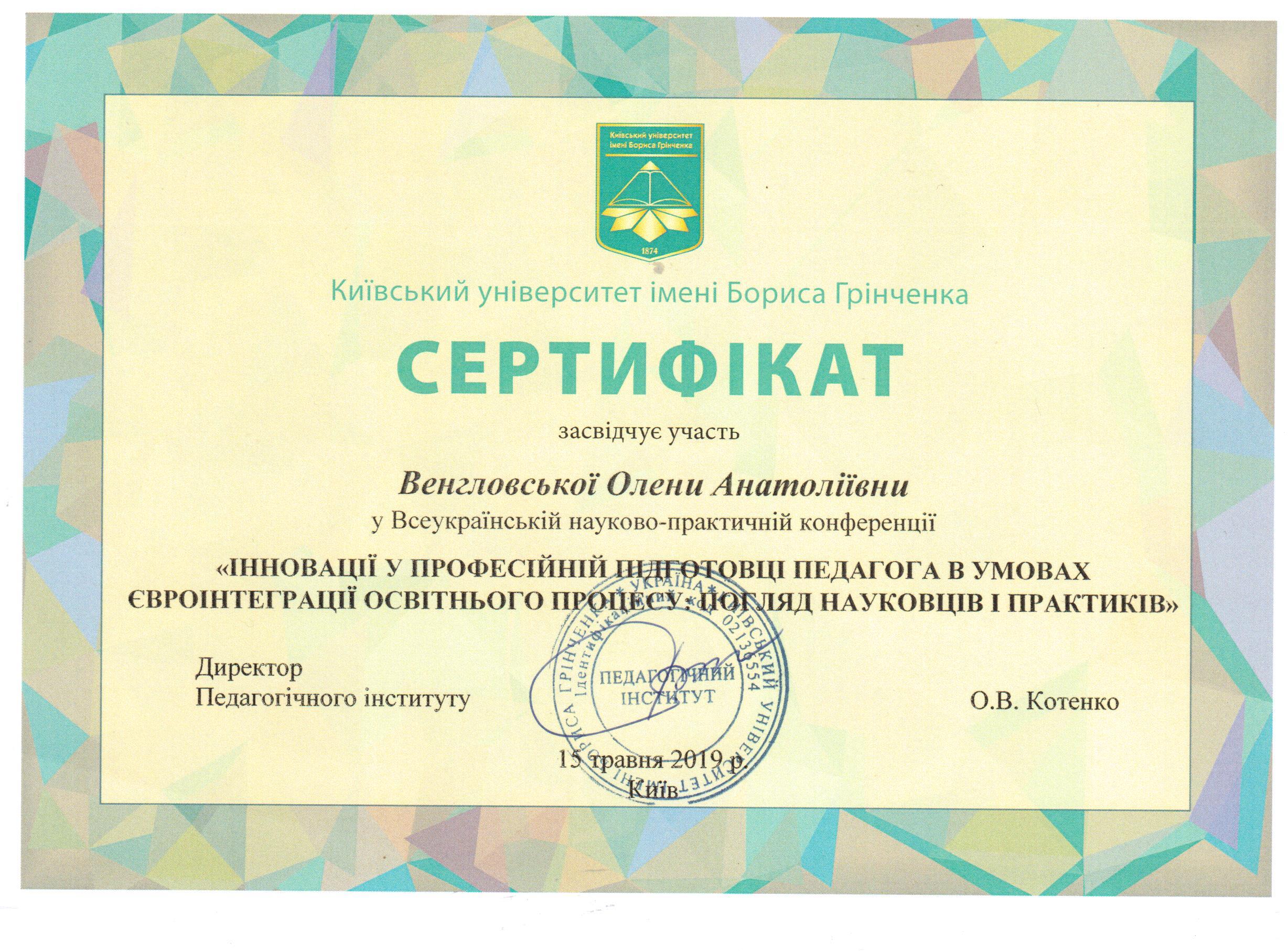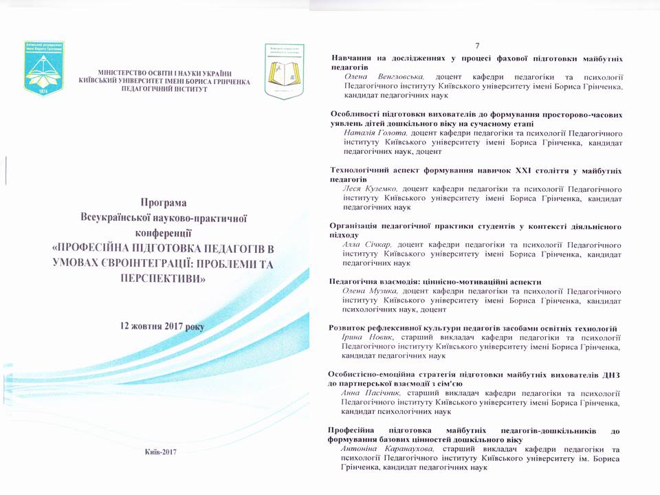 | 1999 | Всеукраїнська науково-практична конференція "Професійна підготовка педагогів в умовах євроінтеграції: проблеми та перспективи" | Навчання на дослідженнях у процесі фахової підготовки майбутніх педагогів | Київський університет імені Бориса Грінченка |
