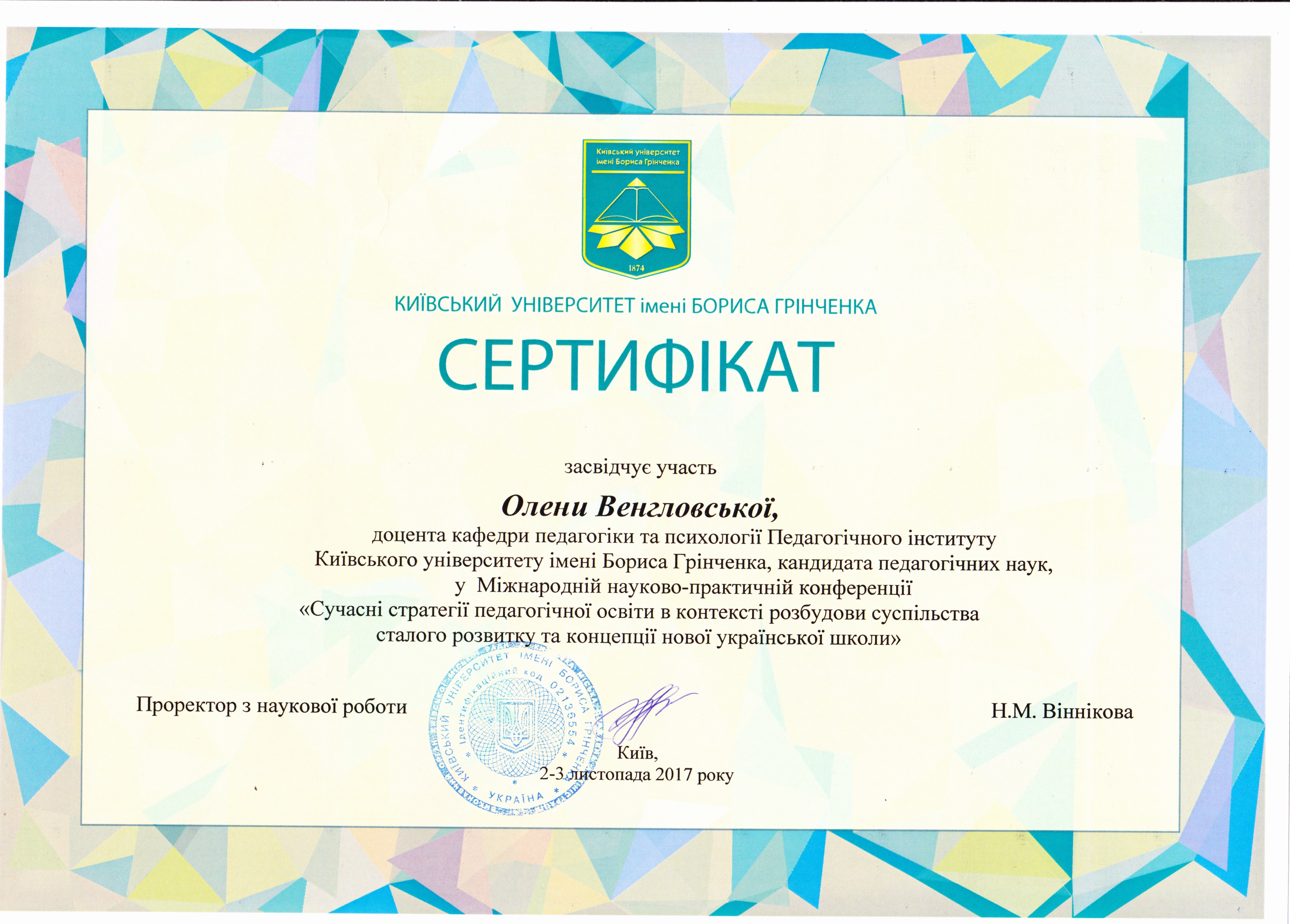 | 2001 | Міжнародна науково-практична конференція "Сучасні стратегії педагогічної освіти в контексті розбудови суспільства сталого розвитку та концепції нової української школи" | Стратегія навчання на дослідженнях майбутніх педагогів у вищих навчальних закладах | Київський університет імені Бориса Грінченка |