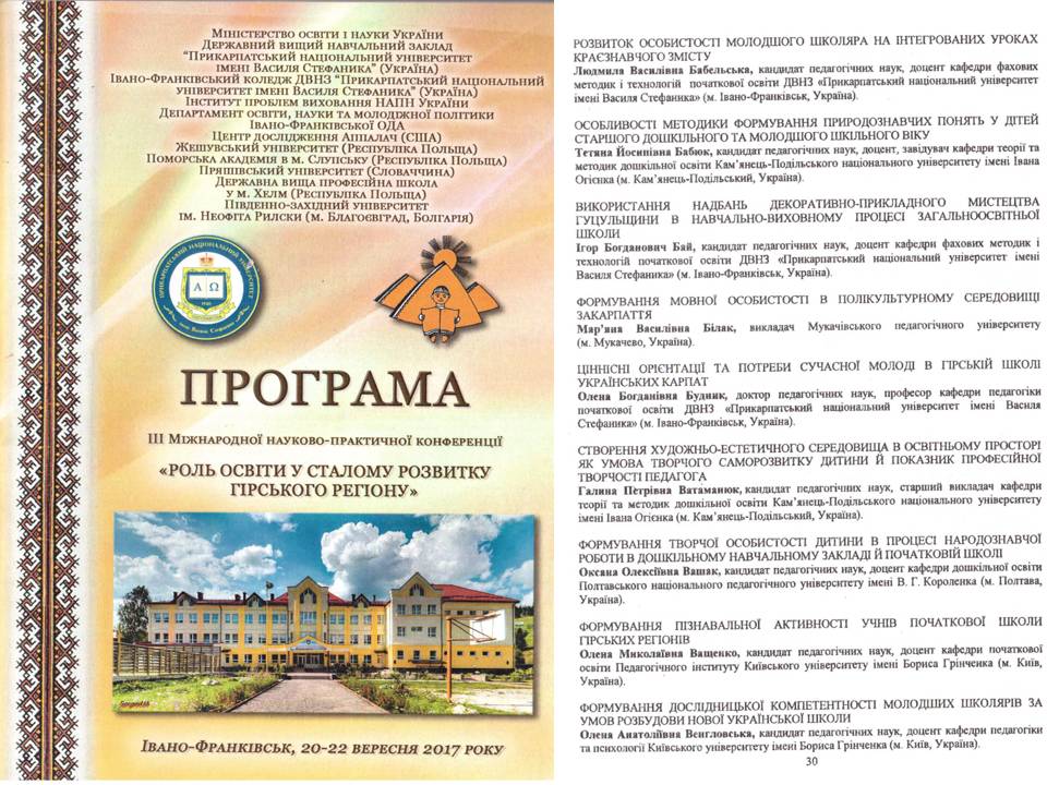 | 2184 | ІІІ Міжнародна науково-практична конференція "Роль освіти у сталому розвитку гірського регіону" | Формування дослідницької компетентності молодших школярів за умов розбудови нової української школи | ДВНЗ "Прикарпатський національний університет імені Василя Стефаника" |