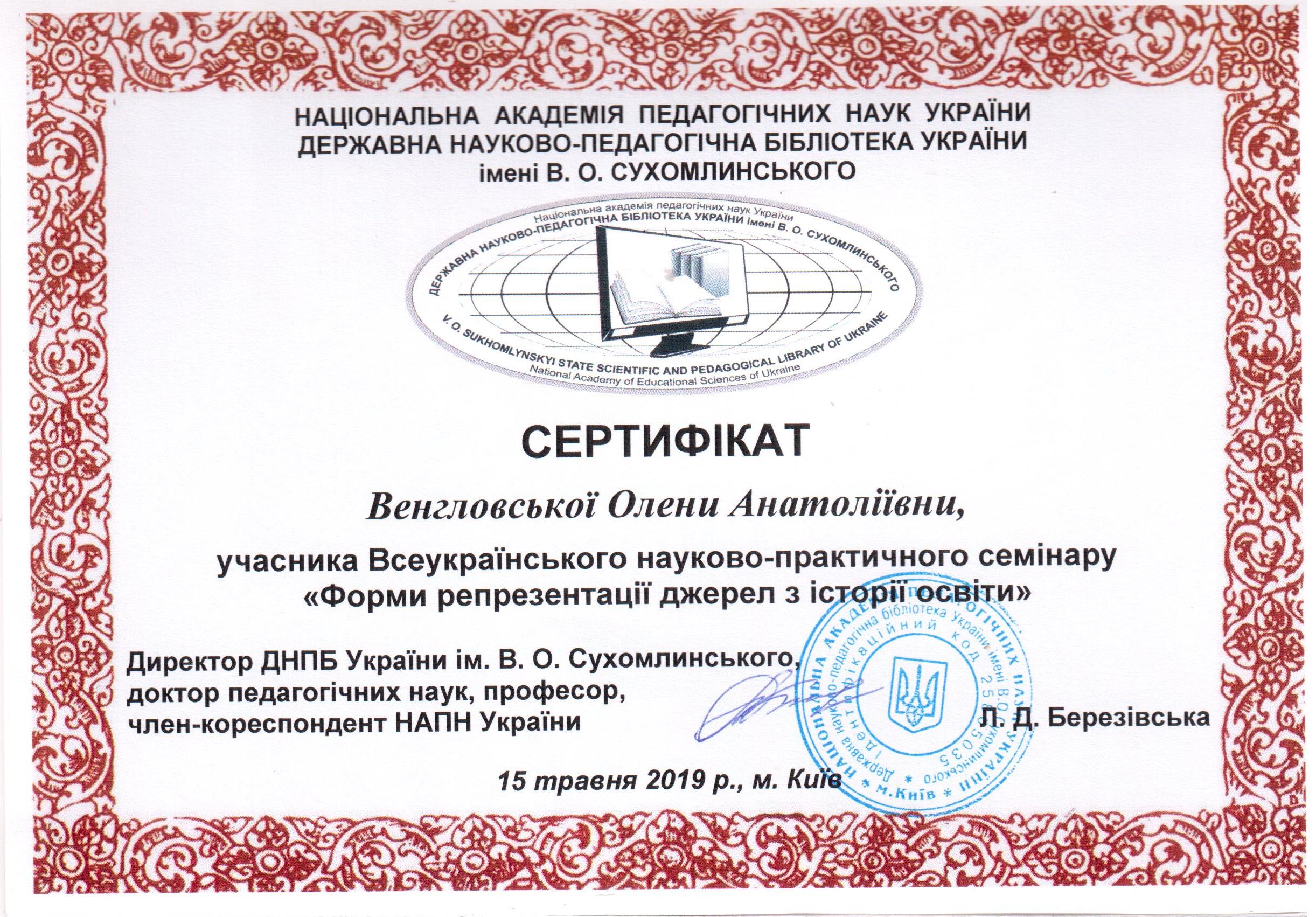 | 4185 | Всеукраїнський науково-практичний семінар "Форми репрезентації джерел з історії освіти" | Значення бібліографічних покажчиків у формуванні джерельної бази магістерських досліджень з історії освіти | Державна науково-педагогічна бібліотека України імені В.О. Сухомлинського |
