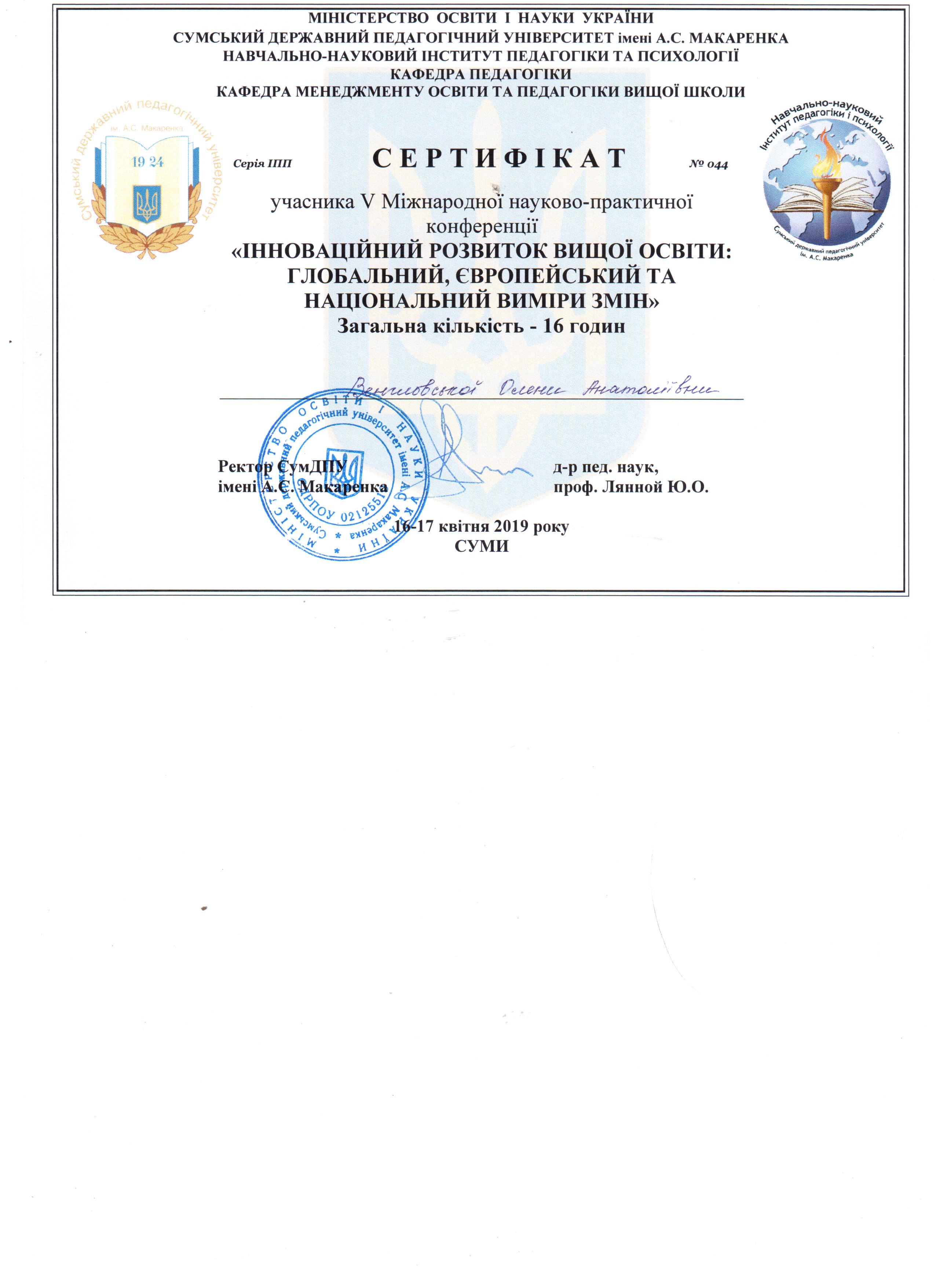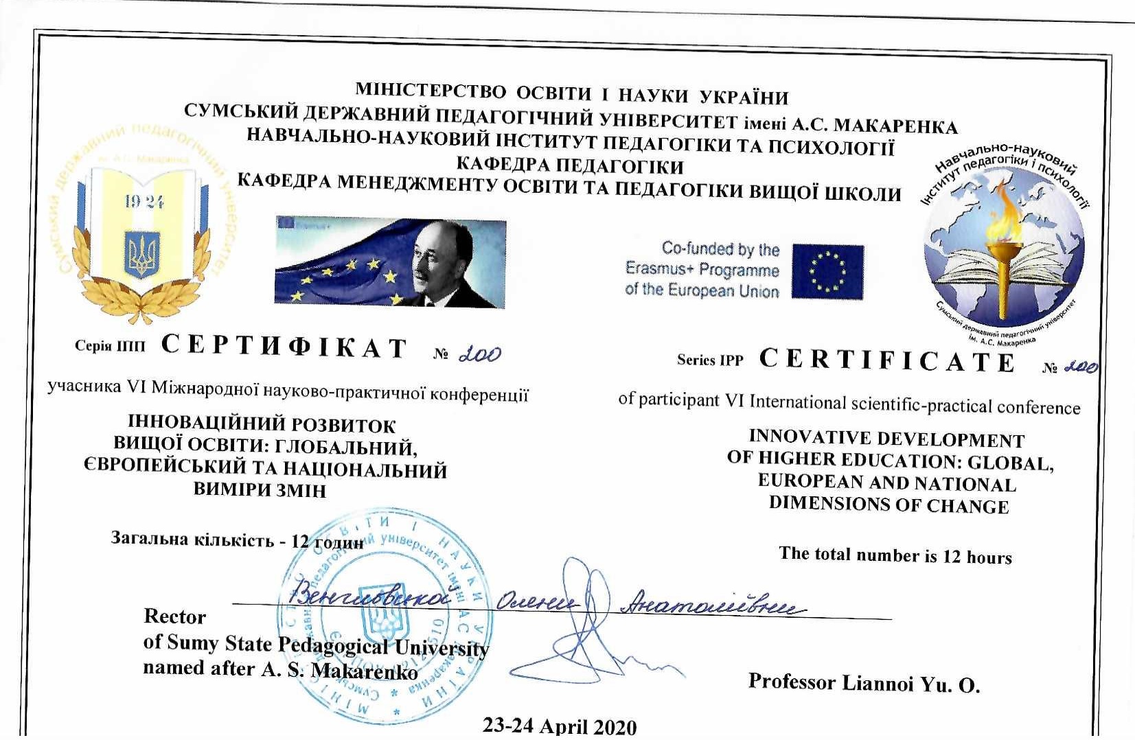| 5505 | VI Міжнародна науково-практична конференція "Інноваційний розвиток вищої освіти: глобальний, європейський та національний виміри змін" | Інноваційні технології професійної підготовки вчителя НУШ | Сумський державний педагогічний університет імені А.С. Макаренка |