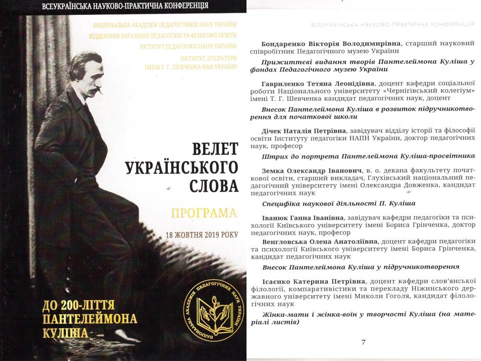 | 4399 | Всеукраїнська науково-практична конференція "Велет українського слова" | Внесок Пантелеймона Куліша у підручникотворення | Інститут педагогіки НАПН України |