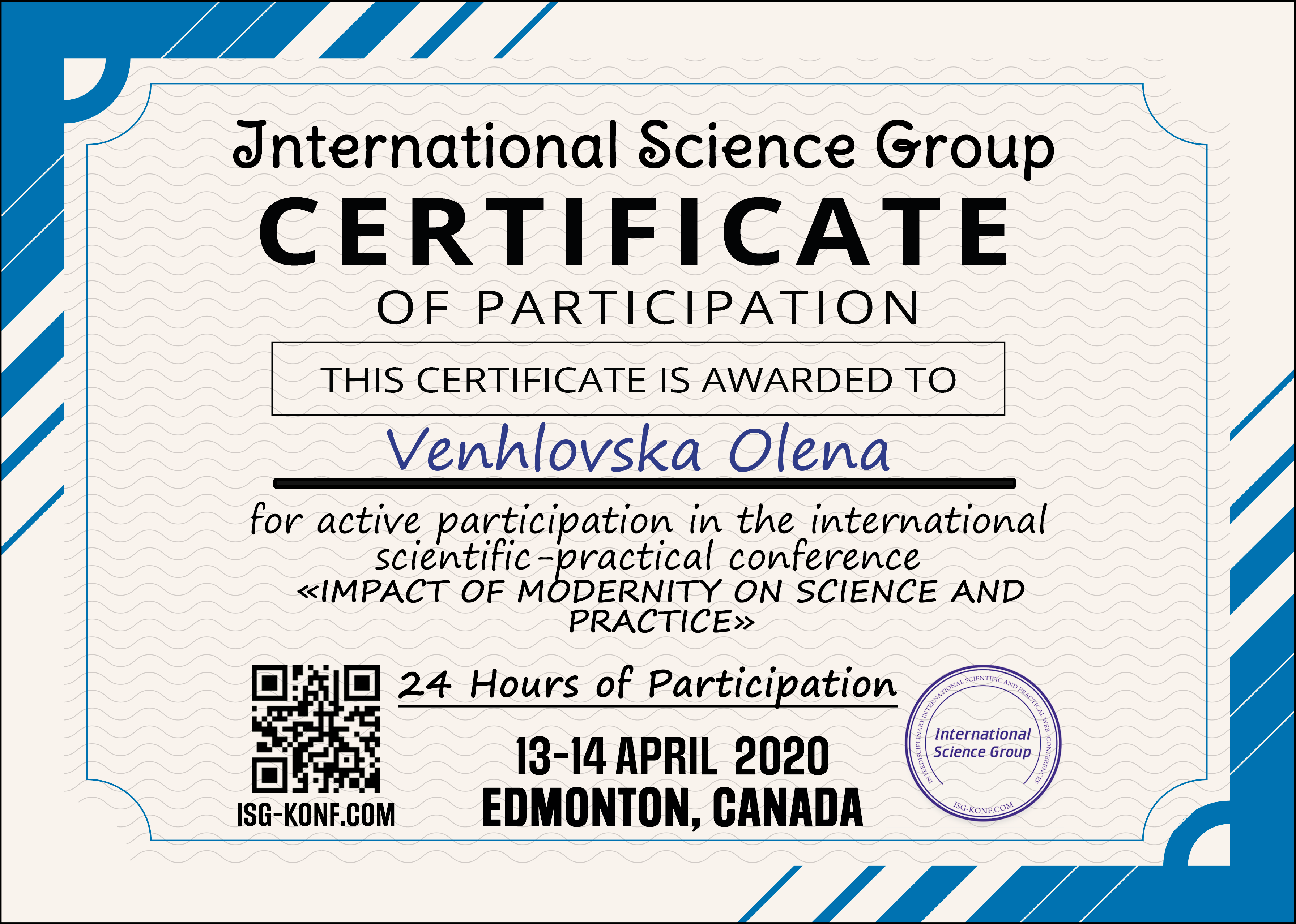 | 5245 | Міждисциплінарна міжнародна науково-практична конференція "IMPACT OF MODERNITY ON SCIENCE AND PRACTICE" | Педагогічні умови співпраці закладу дошкільної освіти з батьками щодо патріотичного виховання дітей | Едмонтон, Канада |