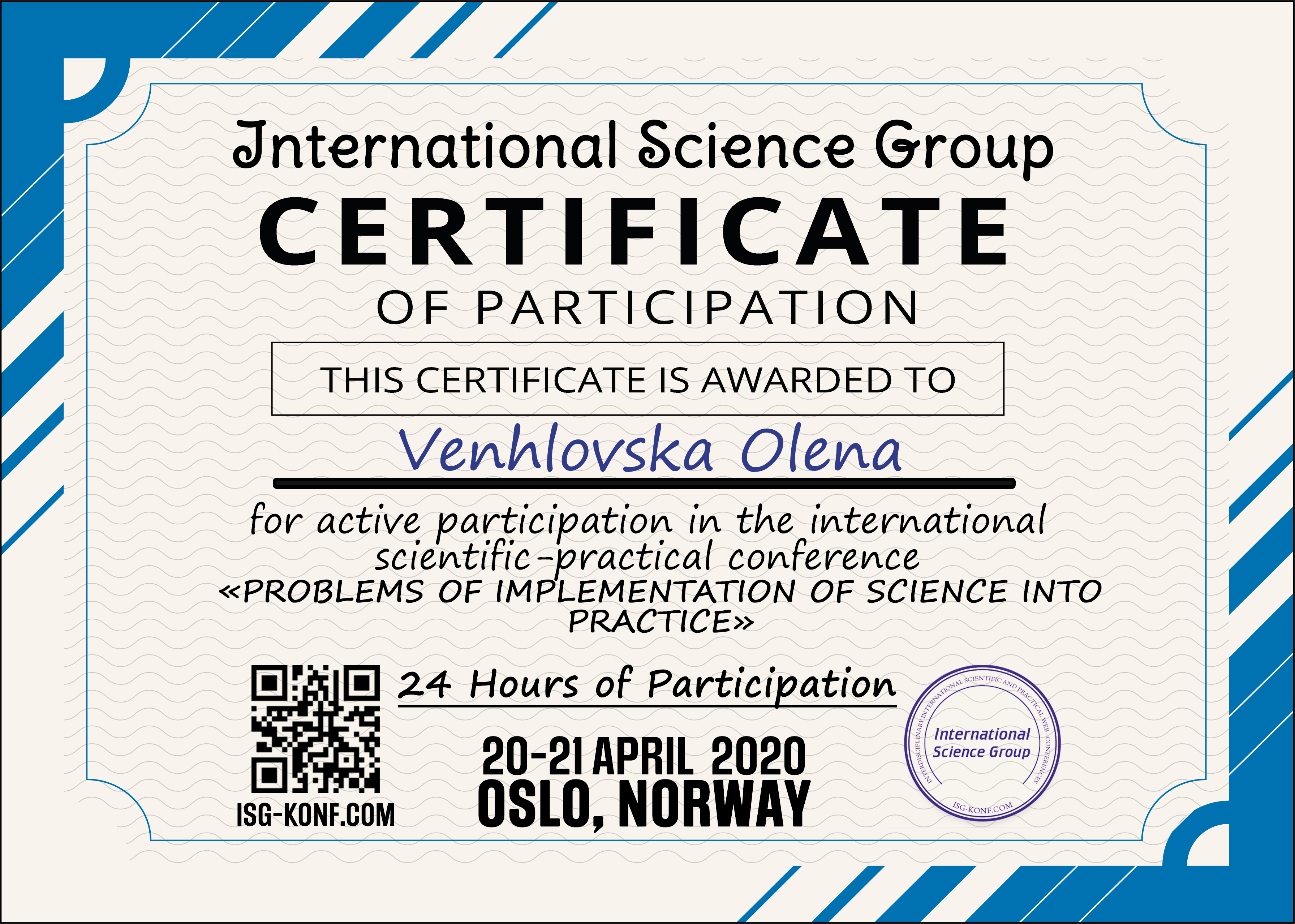 | 5269 | Дистанційна міждисциплінарна міжнародна науково-практична конференція “PROBLEMS OF IMPLEMENTATION OF SCIENCE INTO PRACTICE” | Змістово-технологічне забезпечення формування здоров’язбережувальної поведінки дітей старшого дошкільного віку | Осло, Норвегія |
