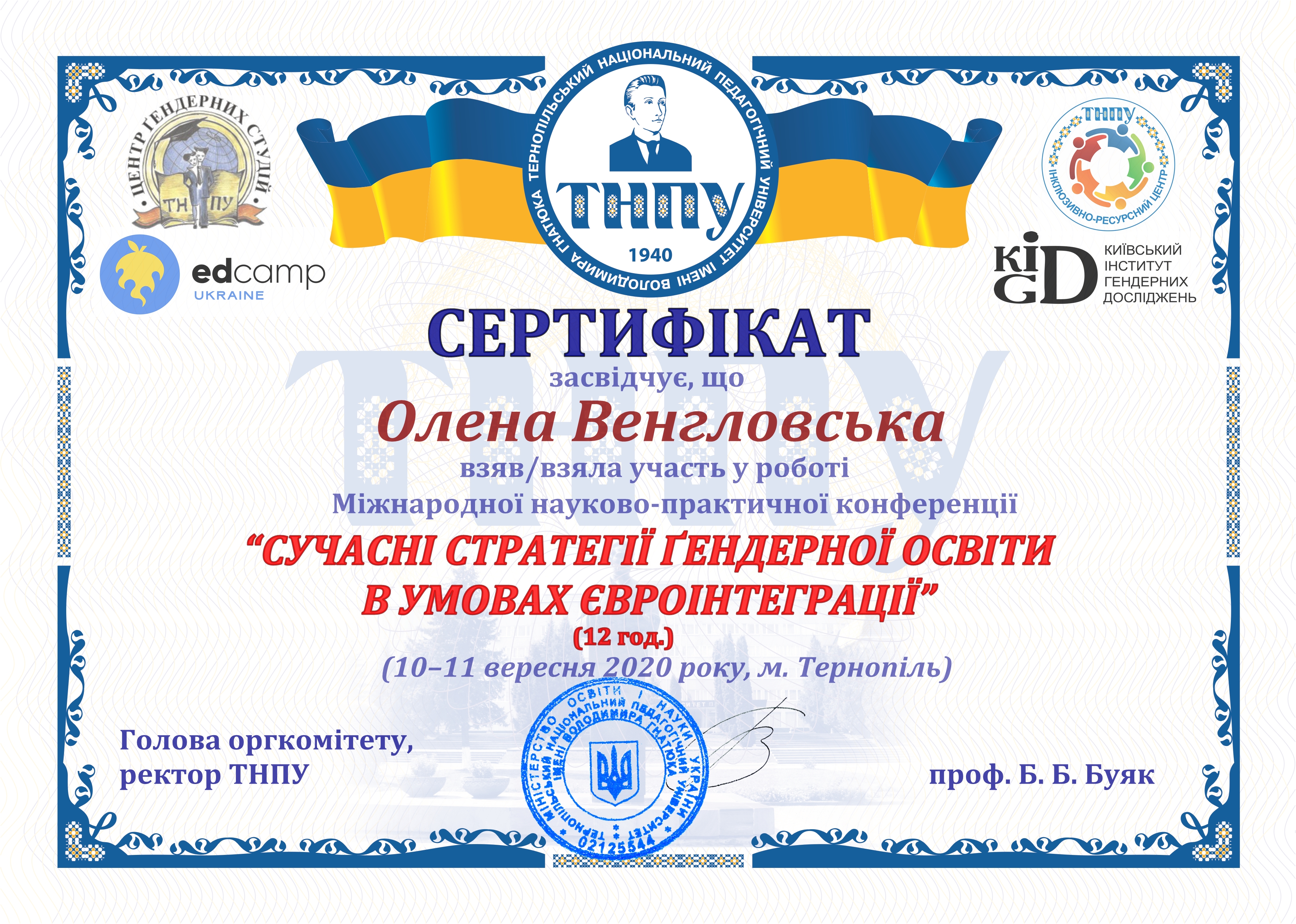 | 5470 | Міжнародна науково-практична конференція"СУЧАСНІ СТРАТЕГІЇ ҐЕНДЕРНОЇ ОСВІТИ В УМОВАХ ЄВРОІНТЕГРАЦІЇ" | Підготовка вчителя Нової української школи до реалізації ґендерного підходу в освіті | Тернопіль |
