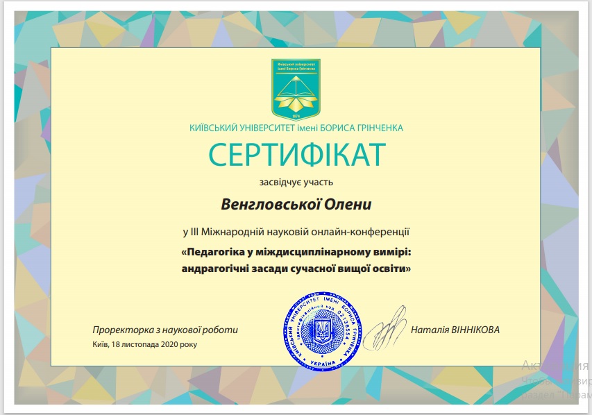 | 5882 | ІІІ Міжнародна онлайн-конференція "Педагогіка у міждисциплінарному вимірі: андрагогічні засади сучасної вищої освіти" | Акмеологічний концепт навчання людини впродовж життя | Київський університет імені Бориса Грінченка |