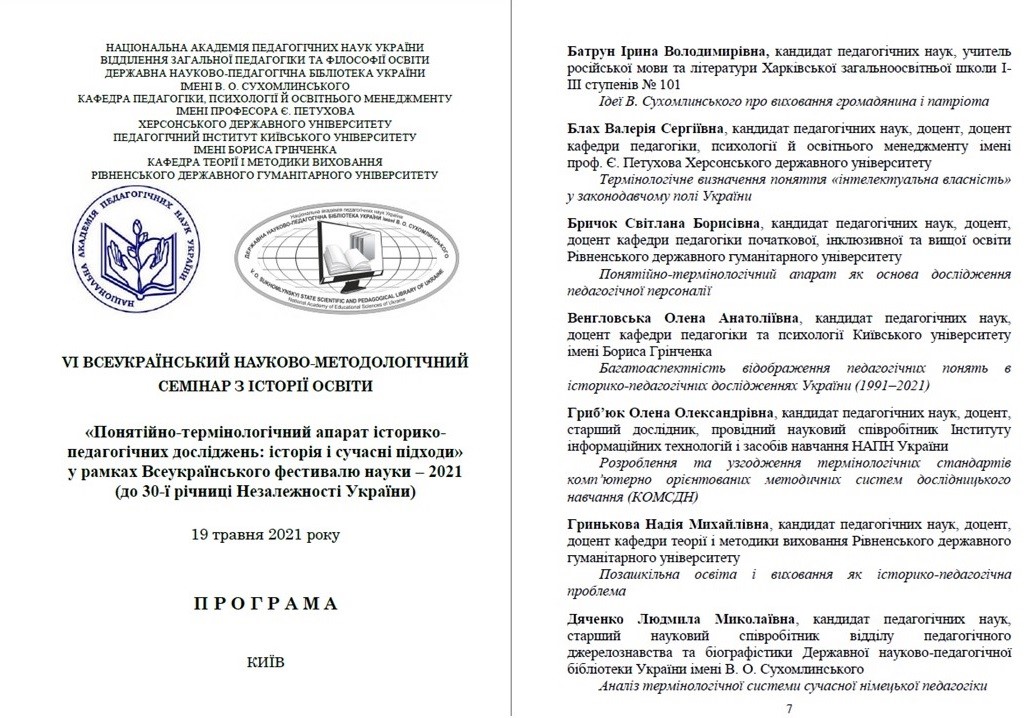 | 7005 | VІ ВСЕУКРАЇНСЬКИЙ НАУКОВО-МЕТОДОЛОГІЧНИЙ СЕМІНАР З ІСТОРІЇ ОСВІТИ «Понятійно-термінологічний апарат історико-педагогічних досліджень: історія і сучасні підходи» у рамках Всеукраїнського фестивалю науки – 2021 (до 30-ї річниці Незалежності України) | Багатоаспектність відображення педагогічних понять в історико-педагогічних дослідженнях України (1991–2021) | Державна науково-педагогічна бібліотека України імені В.О. Сухомлинського |