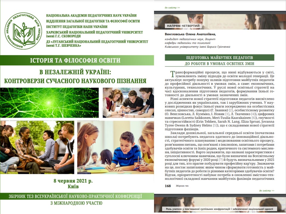 | 7743 | Всеукраїнська науково-практична конференція з міжнародною участю "Історія та філософія освіти в незалежній Україні: контроверзи сучасного наукового пізнання" | Підготовка майбутніх педагогів до роботи в умовах освітніх змін | Інститут педагогіки НАПН України |