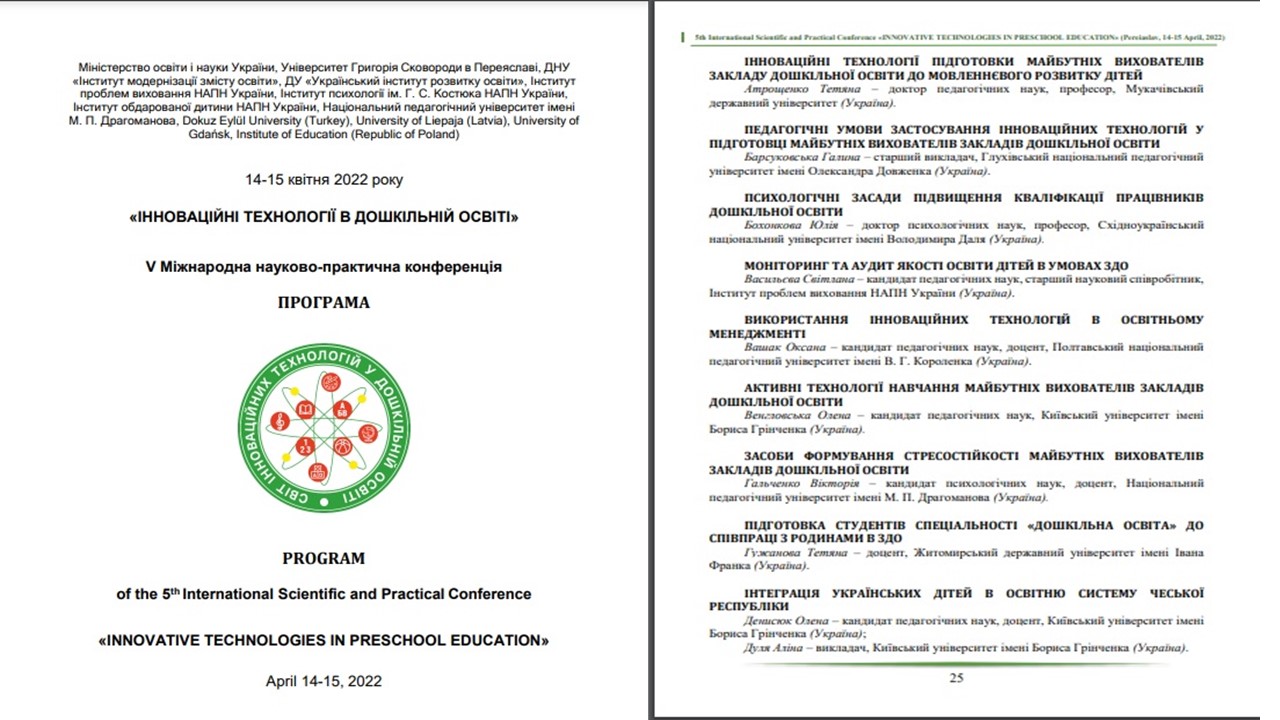 | 7961 | V Міжнародна науково-практична конференція «ІННОВАЦІЙНІ ТЕХНОЛОГІЇ В ДОШКІЛЬНІЙ ОСВІТІ» | АКТИВНІ ТЕХНОЛОГІЇ НАВЧАННЯ МАЙБУТНІХ ВИХОВАТЕЛІВ ЗАКЛАДІВ ДОШКІЛЬНОЇ ОСВІТИ | Переяслав |