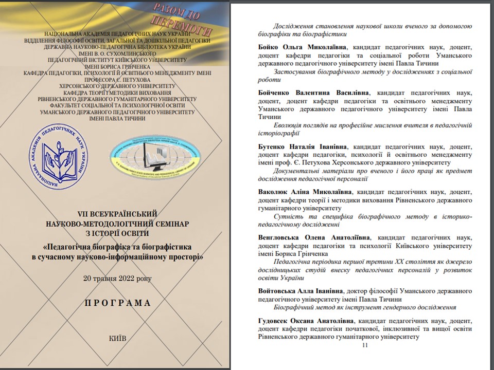 | 11844 | Х ВСЕУКРАЇНСЬКА НАУКОВО-ПРАКТИЧНА КОНФЕРЕНЦІЯ З ІСТОРІЇ ОСВІТИ З МІЖНАРОДНОЮ УЧАСТЮ «Педагогічна біографіка в структурі наук про освіту: ключові концепти, теорії, джерела» | Практики використання біографічних ресурсів у діяльності історико-педагогічних студій | Державна науково-педагогічна бібліотека імені В.О. Сухомлинського | document.pdf | |
