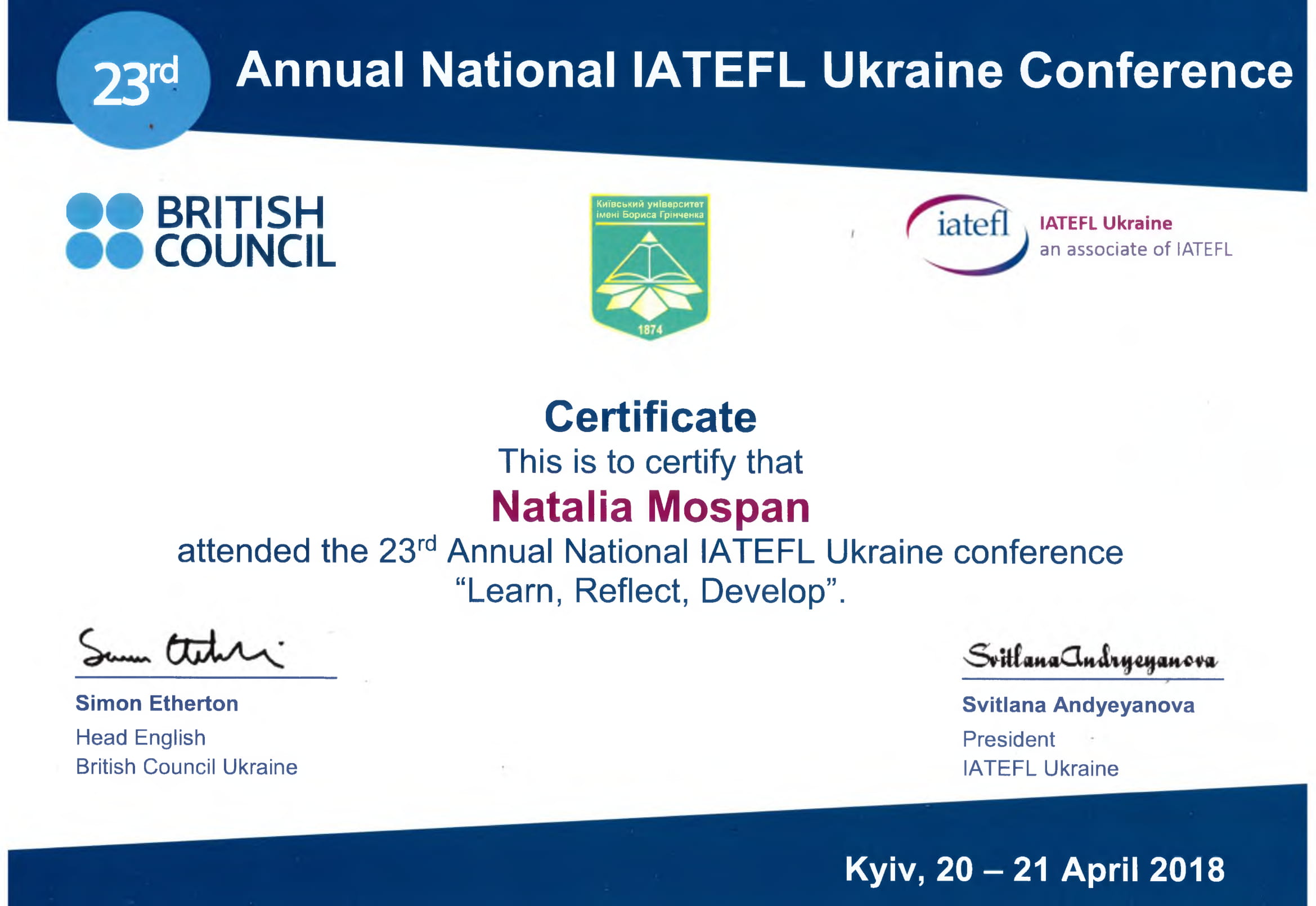 | 3682 | 23-rd Annual National IATEFL Ukraine Conference | Learn, Reflect, Develop | Kyiv |