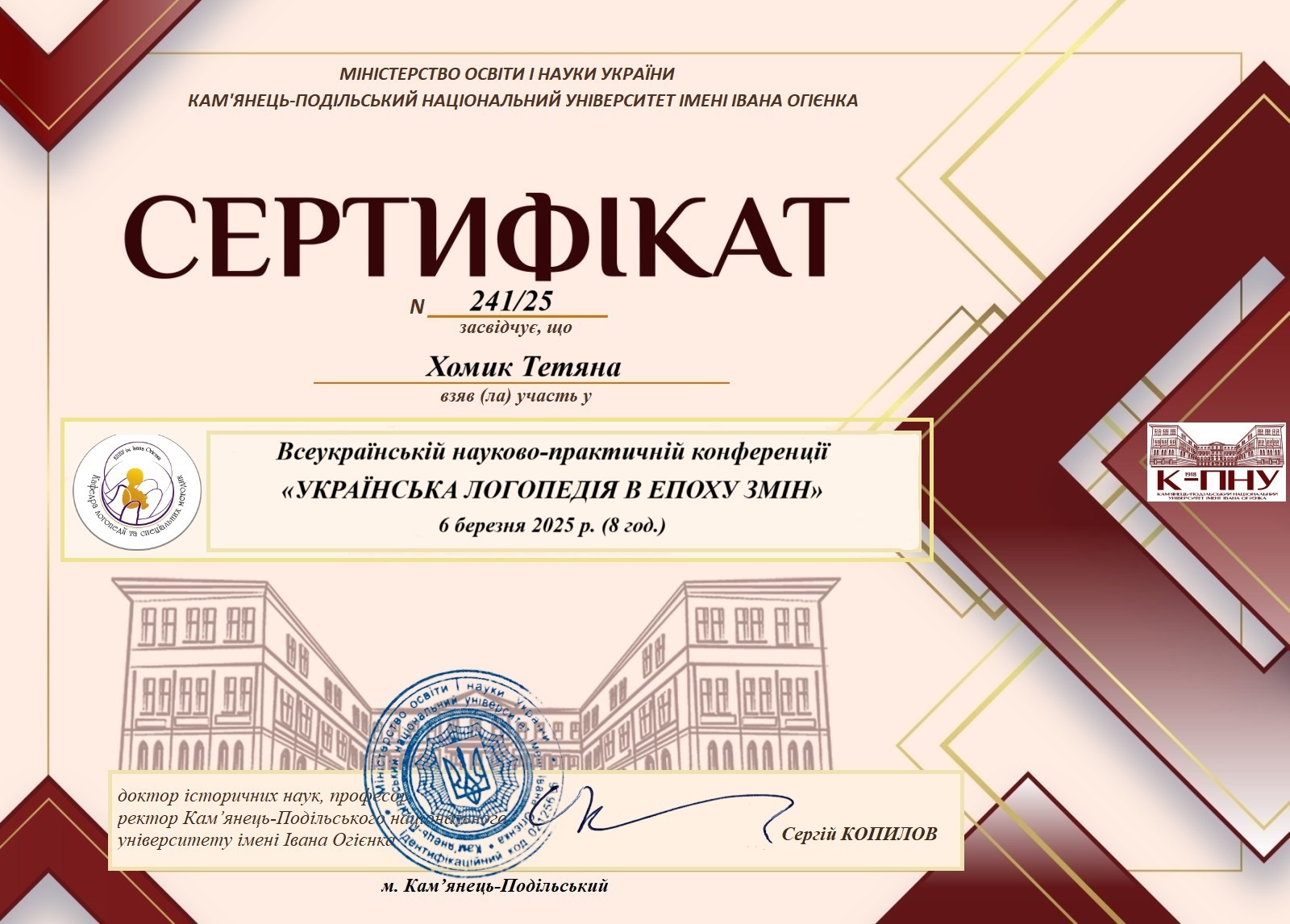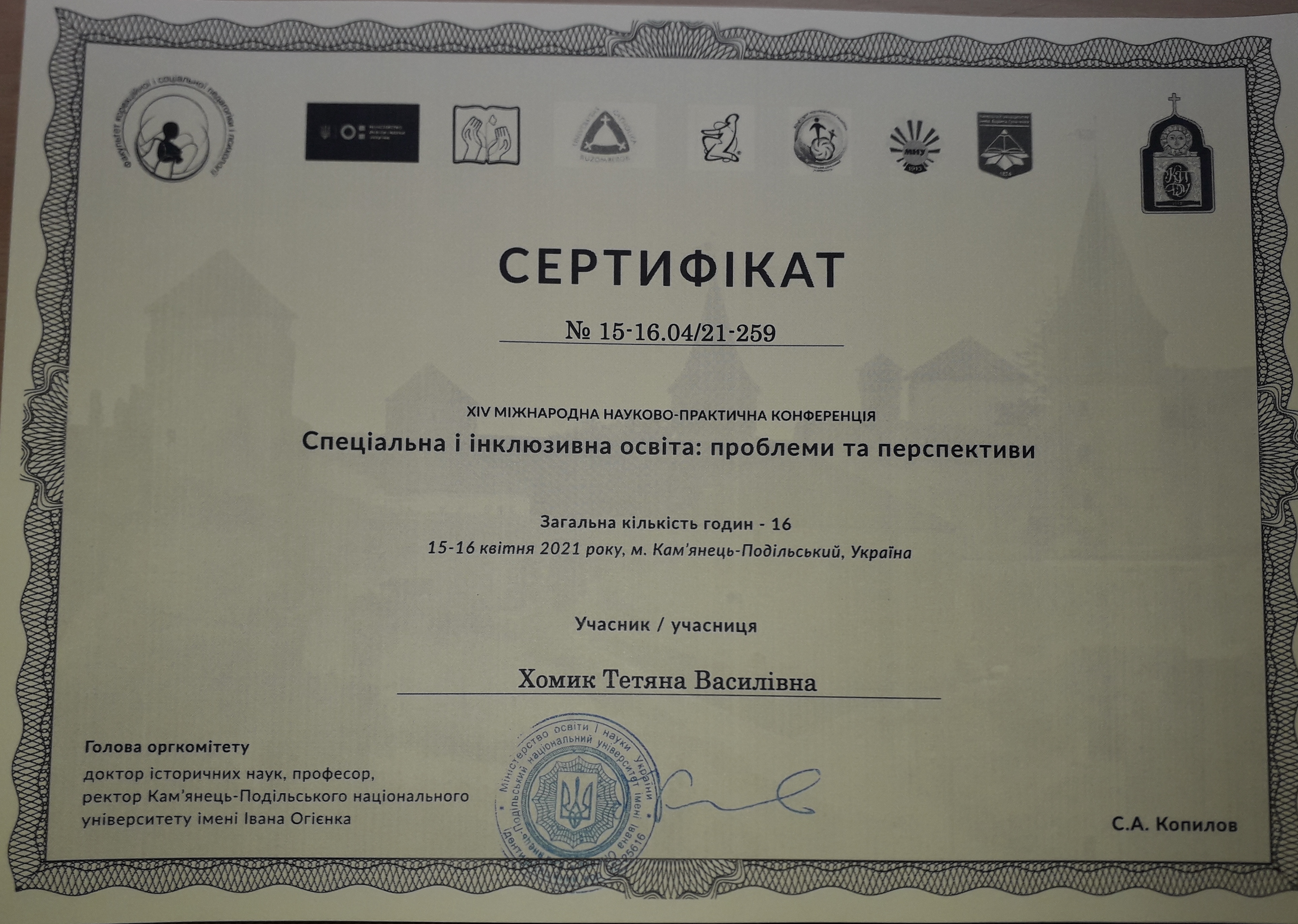 | 6947 | ХІV Міжнародна науково-практична конференція \ | Шляхи подолання фонологічних труднощів у молодших школярів з тяжкими порушеннями мовлення | м. Кам’янець-Подільський , Україна |