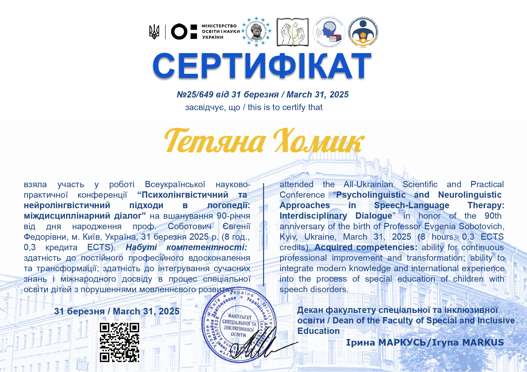 | 11686 | Всеукраїнська науково-практична конференція «ПСИХОЛІНГВІСТИЧНИЙ ТА НЕЙРОЛІНГВІСТИЧНИЙ ПІДХОДИ В ЛОГОПЕДІЇ: МІЖДИСЦИПЛІНАРНИЙ ДІАЛОГ» | --- | м. Київ, Україна |