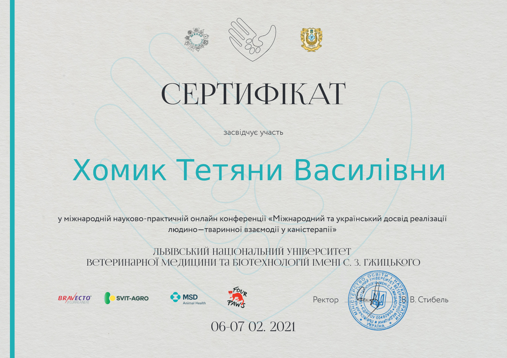 | 6545 | УКРАЇНСЬКИЙ ТА МІЖНАРОДНИЙ ДОСВІД ЗДІЙСНЕННЯ ЛЮДИНО-ТВАРИННОЇ ВЗАЄМОДІЇ У КАНІСТЕРАПІЇ | --- | м. Львів, Україна |